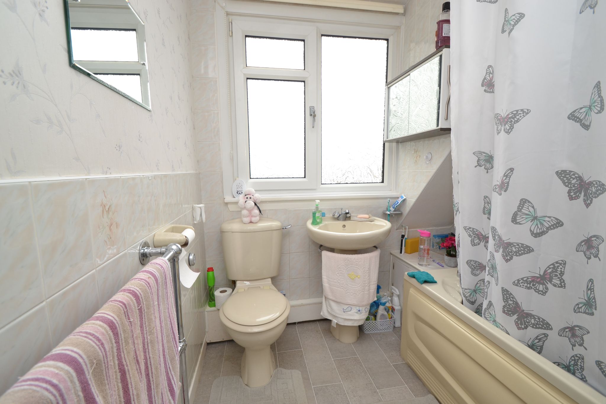 Bathroom: Three piece suite, shower rail and curtain, shower over the bath, school type chrome heated towel rail, fully tiled, frosted Upvc dg window.