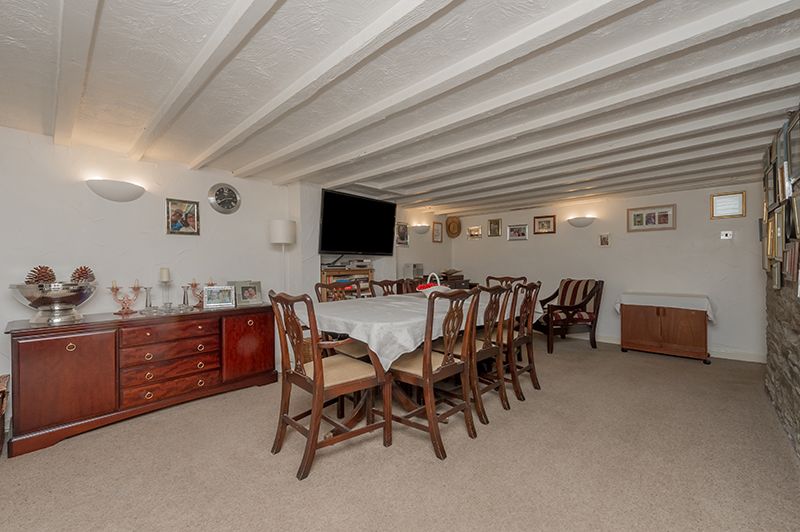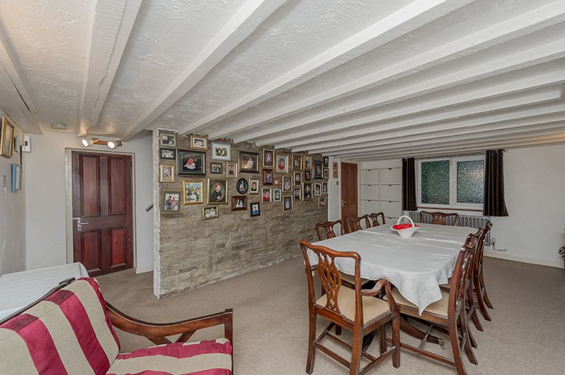 Family Reception Room/Dining Room: Exposed stone wall, space for a large dining table and chairs, beams, fireplace feature, Upvc dg frosted windows, radiators.