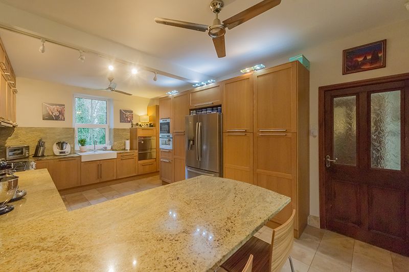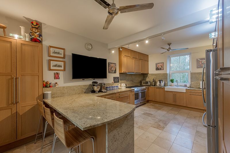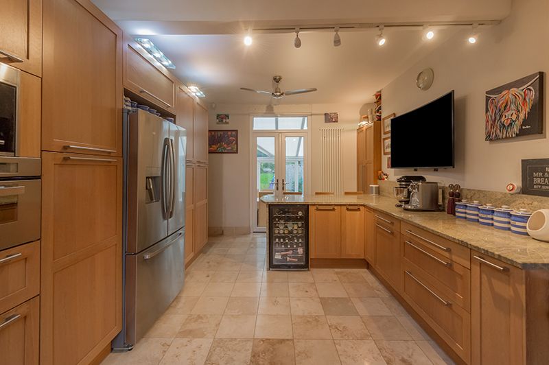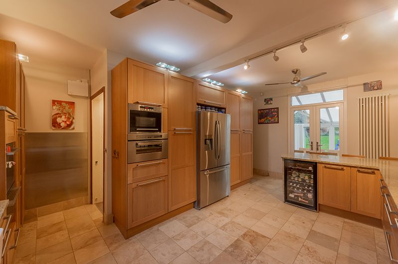 Breakfast Kitchen: Excellent range of wall & base units in modern oak, granite work tops with matching splash backs, large white sink with a mixer tap, built in microwave and a Hotpoint electric steam oven, two dishwashers, stainless steel Range with 4 gas burners, Hot point pull out double extractor and light, double electric oven plus indoor barbeque, AEG American style fridge freezer to remain, wine cooler, Travertine floor to the under floor base units, two ceiling fans to remain, pop up plug sockets, Upvc dg window to rear, contemporary upright radiator.