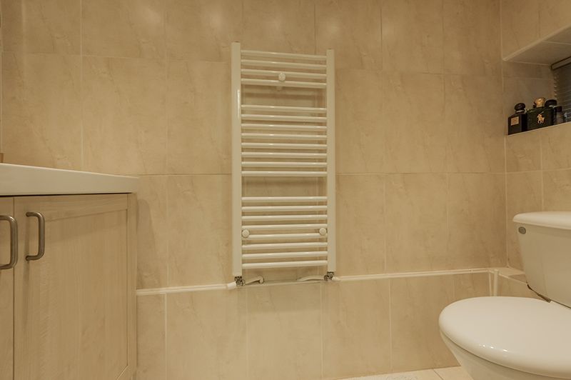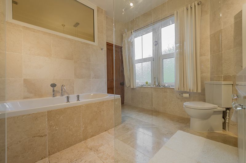 Large Family Bathroom: Bath in white, chrome fittings to include a shower head, fully tiled, walk in glass shower cubicle with a chrome thermostatically controlled shower unit, vanity wall mirror with lighting above, Jack & Jill wash basin in white with chrome mixer taps set on vanity unit, wc, contemporary upright radiator and back ground upright electric radiator, two mullion style Upvc dg windows, tiled floor.