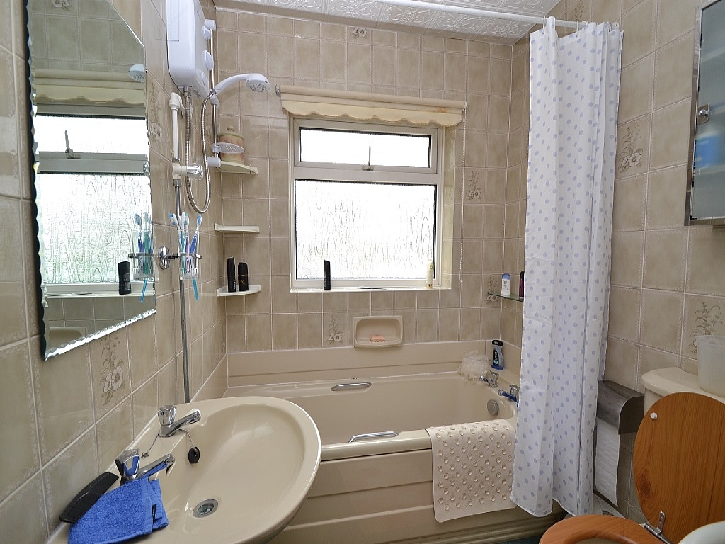 Bathroom: Three piece suite in champagne, electric shower over the bath with rail & curtain, fully tiled, frosted Upvc dg window, ch radiator, airing cupboard.