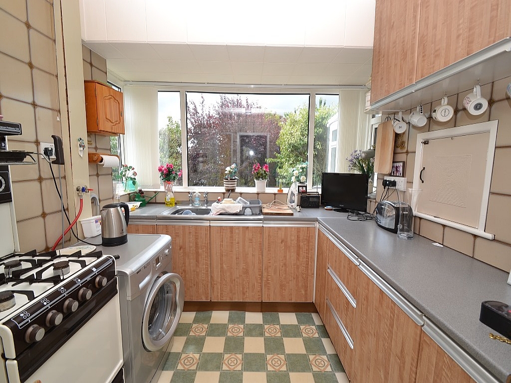Kitchen: 2'54m x 2'02m. Range of fitted wall & base units, work tops with tiling above, Upvc dg bay window to rear, plumbed for an auto-washer, piped for a gas cooker, stainless steel sink, space for a fridge freezer, serving hatch into dining room, side Upvc door, pantry cupboard.