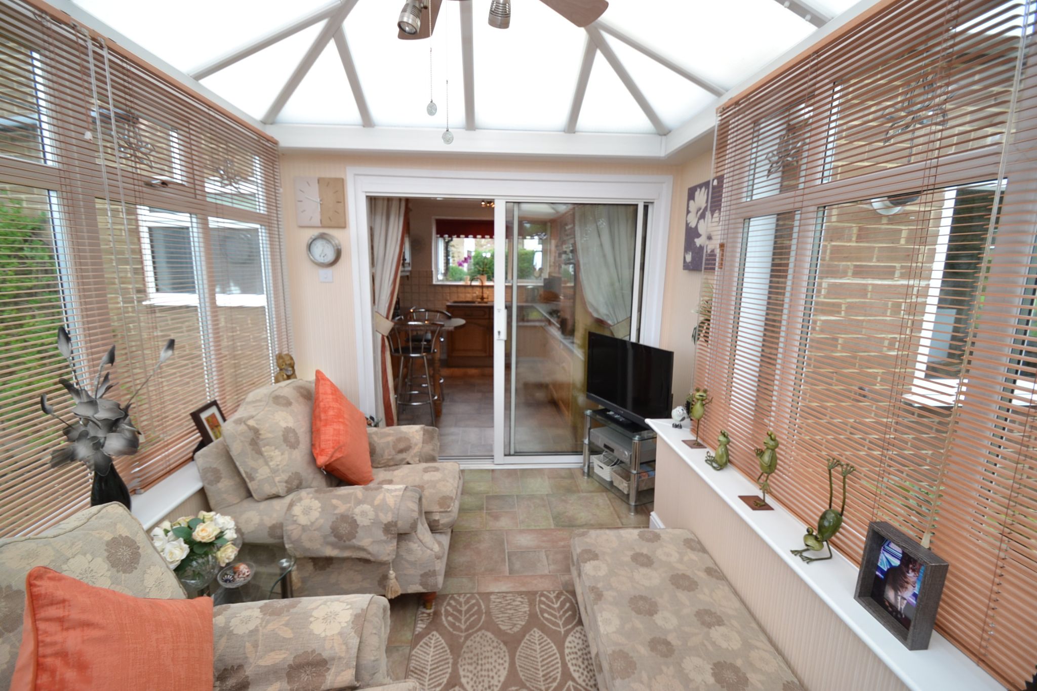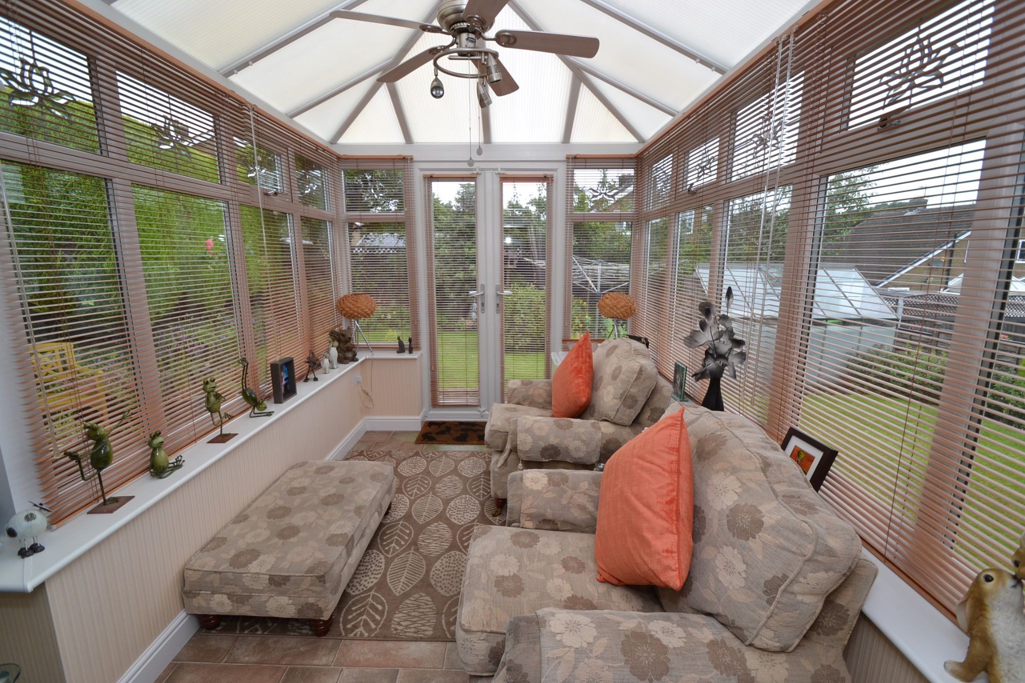 Upvc dg conservatory: Rear French doors, power points, ceiling light fan unit, fitted blinds.