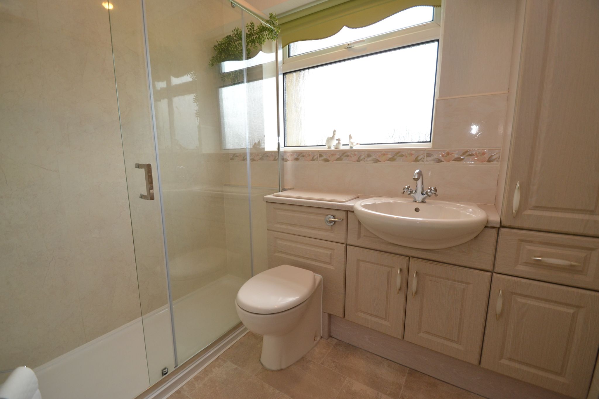 Shower Room: Large shower cubicle with a sliding door and chrome thermostatically controlled shower unit, wash basin and wc in an enclosed unit, fitted furniture, radiator.