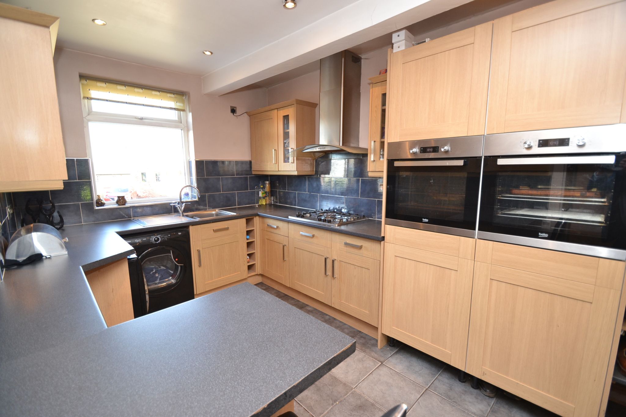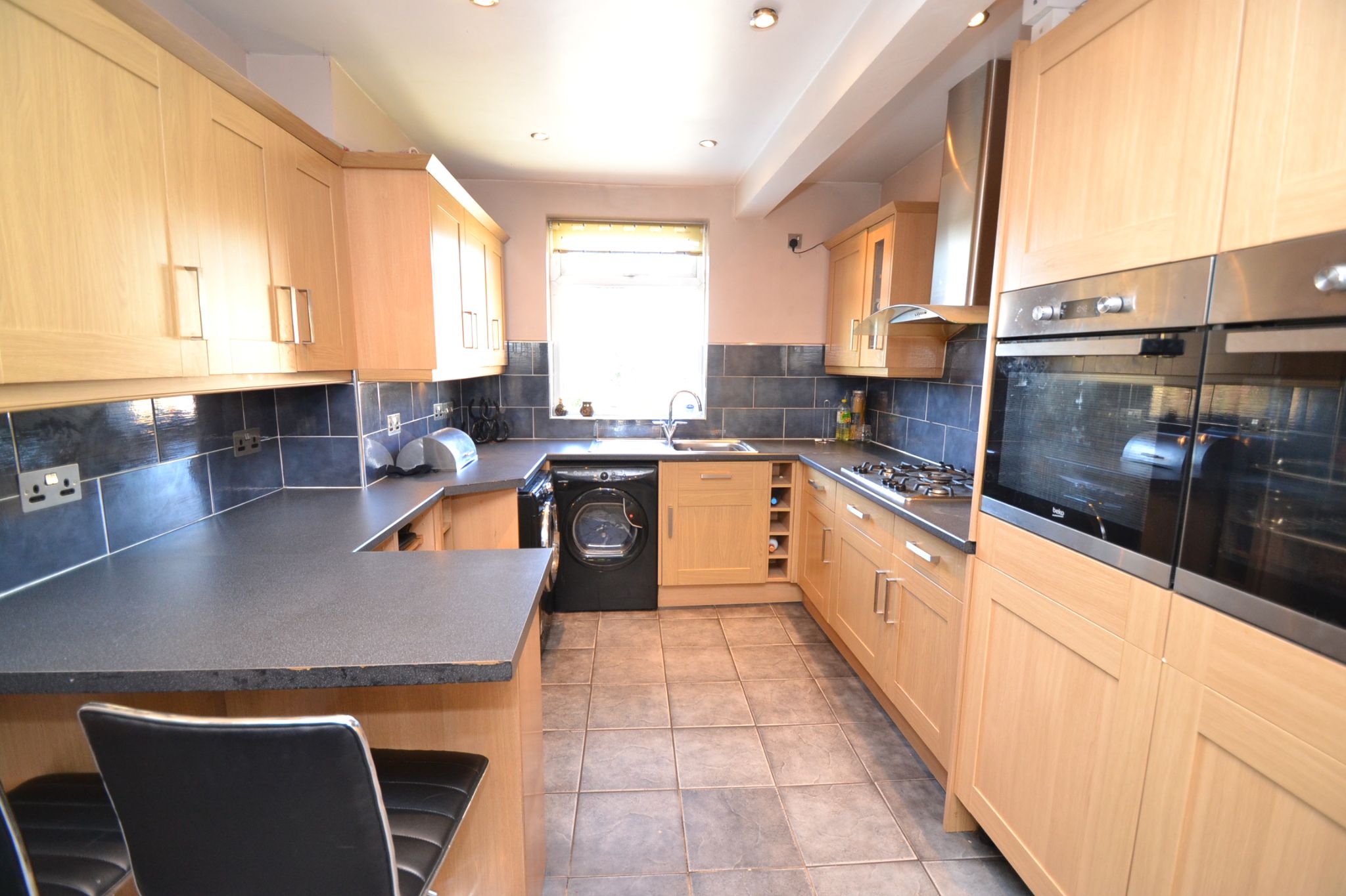 Kitchen: 4.68m x 2.95m (15'3 x 9'6). Extensive range of wall & base units in modern oak, work tops with underlighting and tiling above, stainless steel sink with a mixer tap, space for a tall boy fridge freezer, plumbed for an auto-washer and dryer, built in double electric oven, extractor and light over a 5 ring gas Stoves stainless steel hob, tiled floor, wall cupboard houses the Vaillant Eco tec Pro28 condensing boiler, Upvc dg windows to front & side, inset ceiling lights.