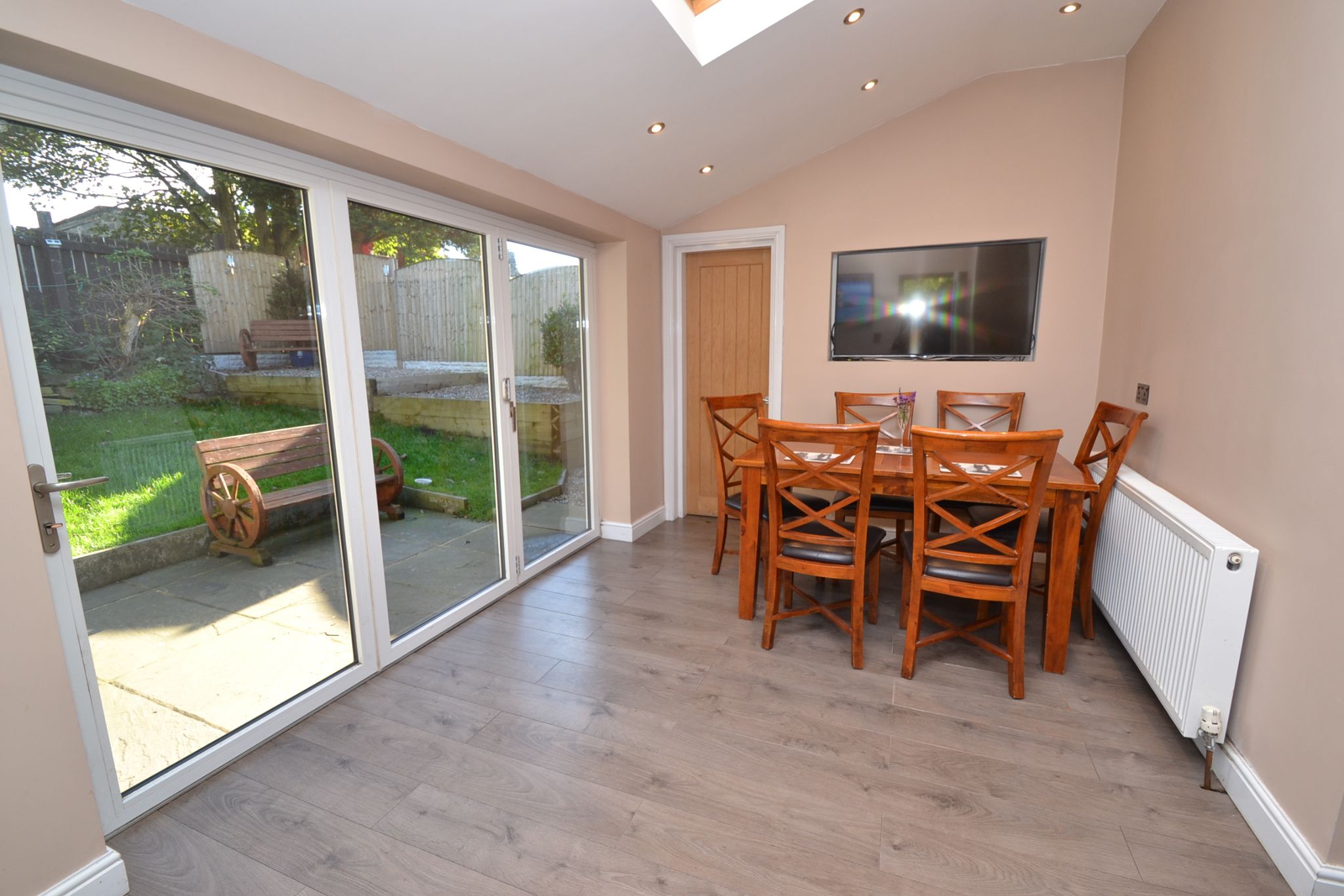 Extended Dining Room: 4.33m x 2.61m (14'2 x 8'5). Dg velux skylight, rear Upvc dg Bi-Fold doors, inset lighting, radiator, plank effect laminate floor, side composite entrance door, nice light and airy room over looking the garden.