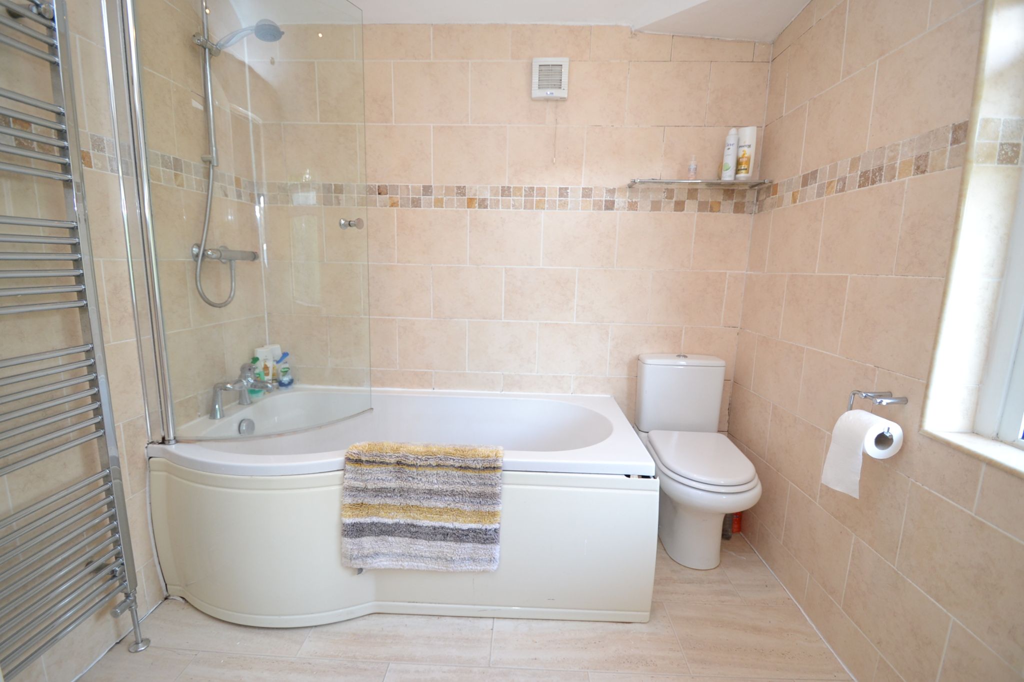 Bathroom: 2.22m x 2.07m (7'2 x 6'7). Three piece suite in white, fully tiled in stone effect tilies, chrome fittings with P shaped bath and glass screen and thermostatically controlled chrome shower unit over the bath, frosted Upvc dg window, heated chrome towel rail, inset ceiling lights.