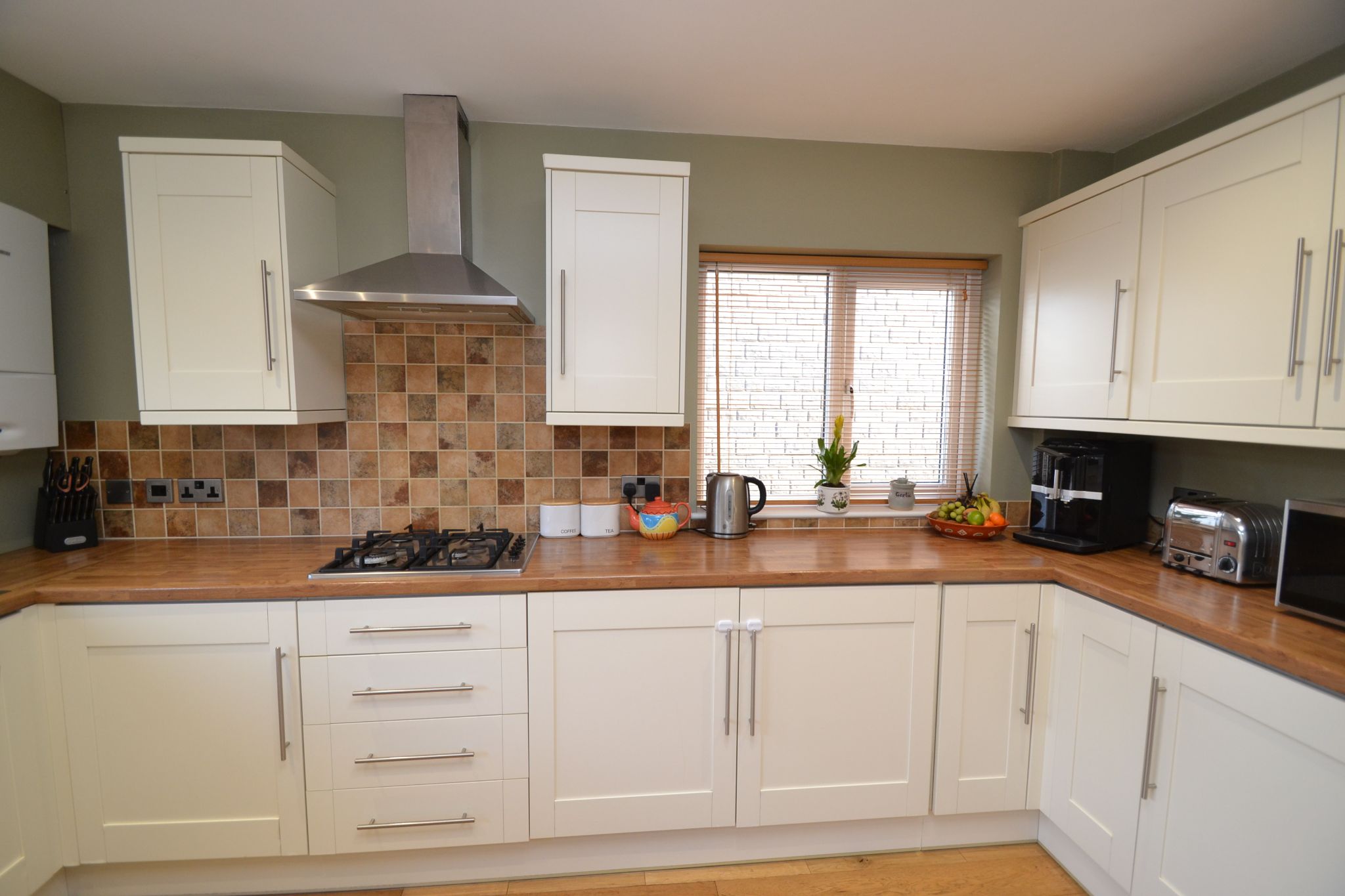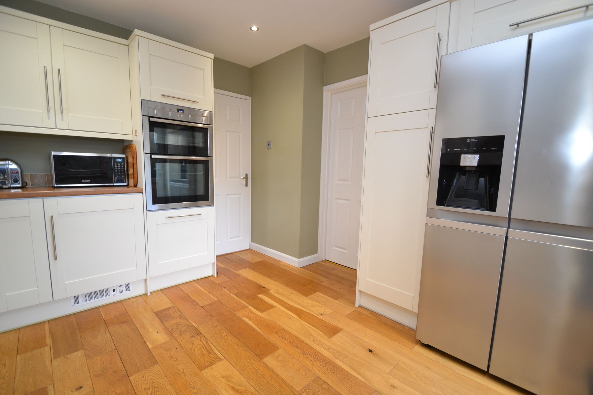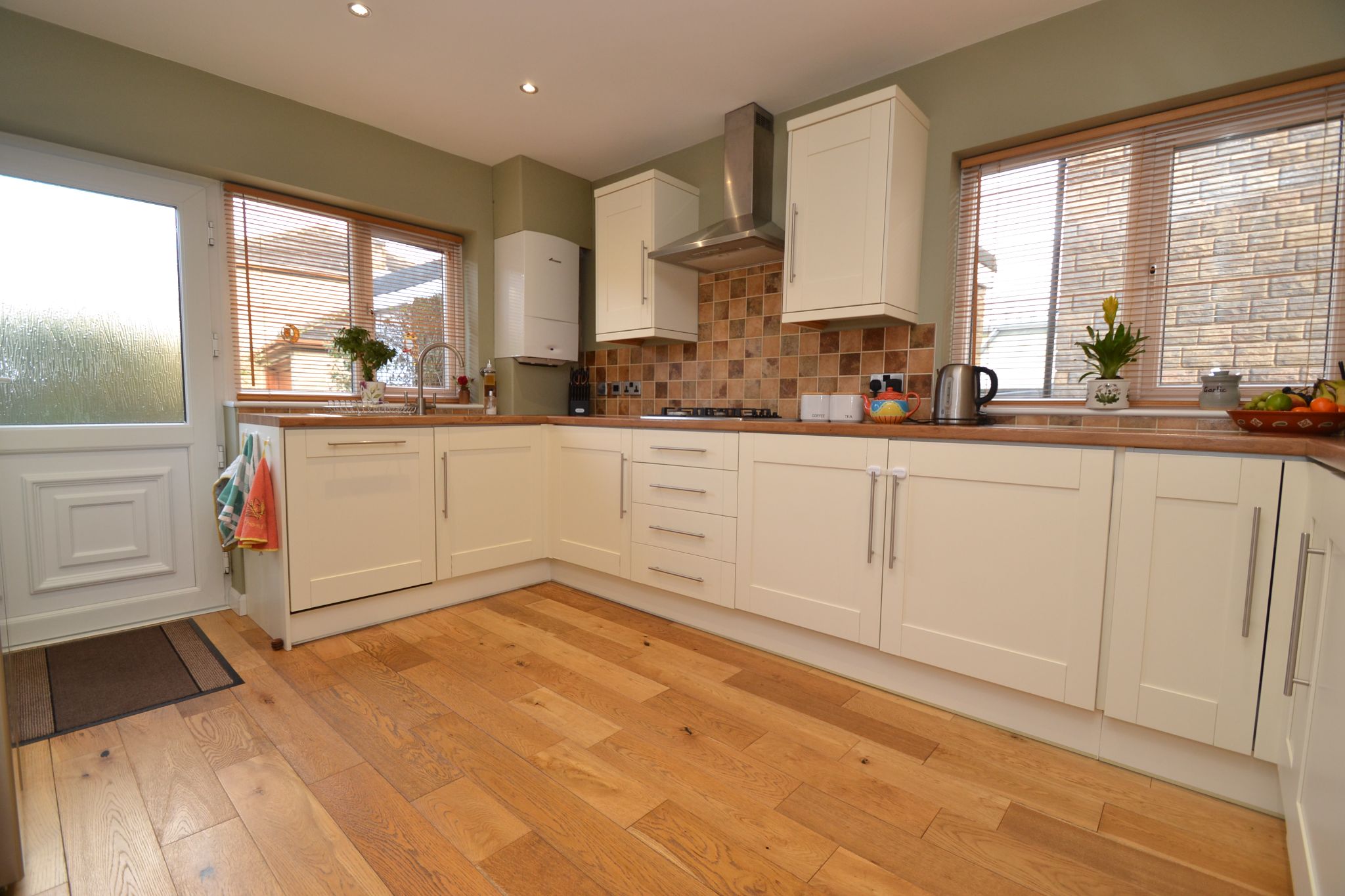 Kitchen: Extensive range of modern wall & base units, work tops with attractive tiling above, built in Neff double electric ovens in stainless steel, stainless steel 4 ring gas hob with an extractor and light hood over, stainless steel 1.5 sink with a mixer tap, integrated Bosch dishwasher and integrated auto-washer, The American LG fridge freezer with a drinks dispenser is free standing but is included, wall mounted Worcester Bosch MT10 boiler, remote control plinth heater, solid oak wood floor, side and rear Upvc dg windows with fitted blinds, inset ceiling lights, rear part glazed entrance door.