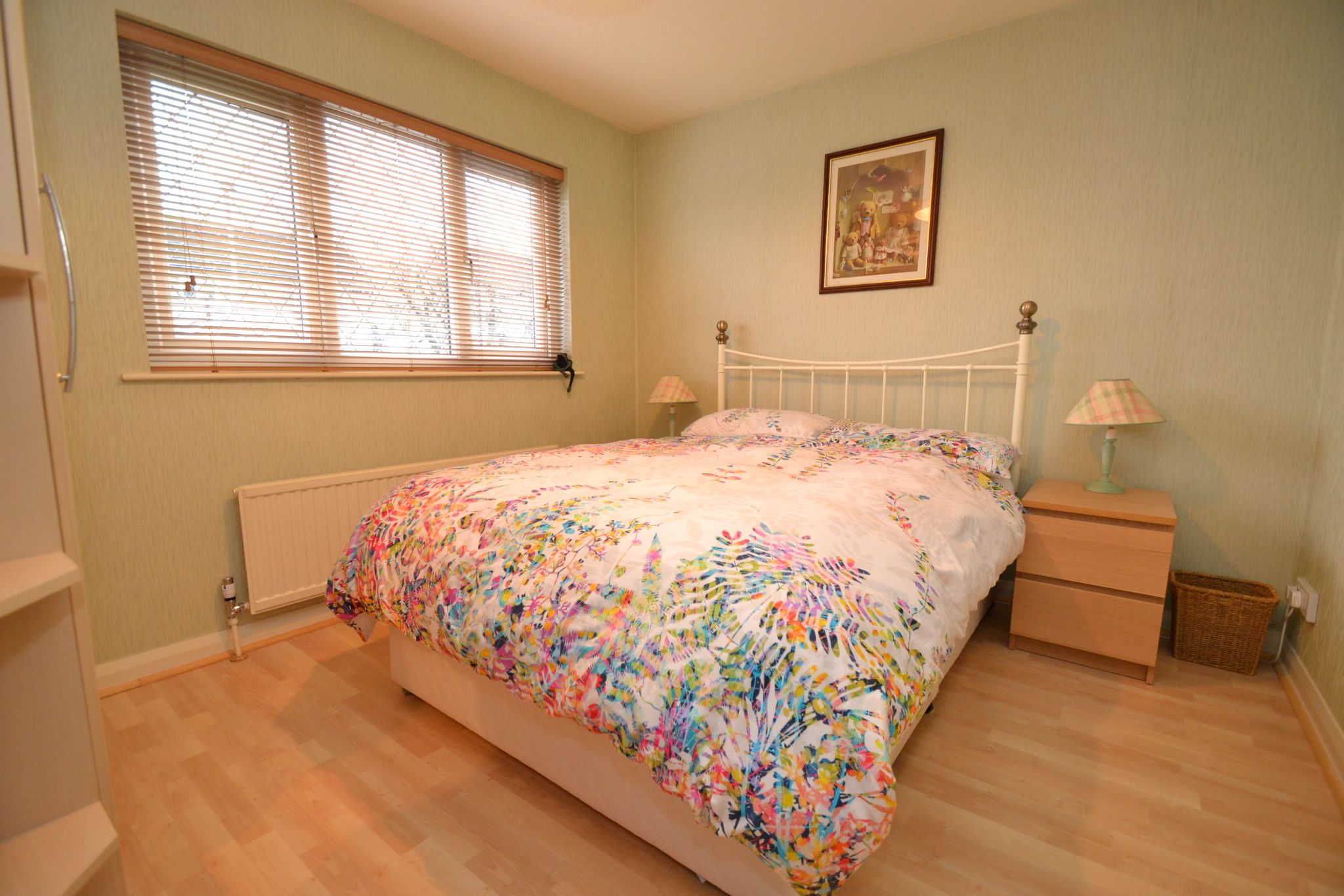 Bedroom 2: Front Upvc dg diamond leaded windows with a fitted blind, radiator under, laminate flooring, wardrobe to remain.