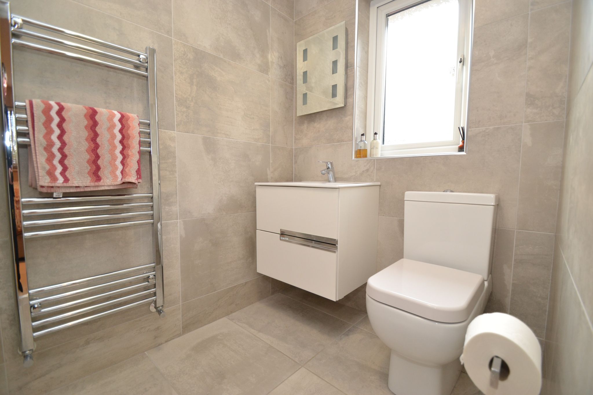 Wet Room: Fully tiled to walls and floor, chrome thermostatically controlled shower unit, wash basin set on a high gloss vanity unit, wc, heated chrome towel rail, frosted Upvc dg window, touch screen digital light wall vanity mirror, extractor to ceiling, benefitting from under floor heating.