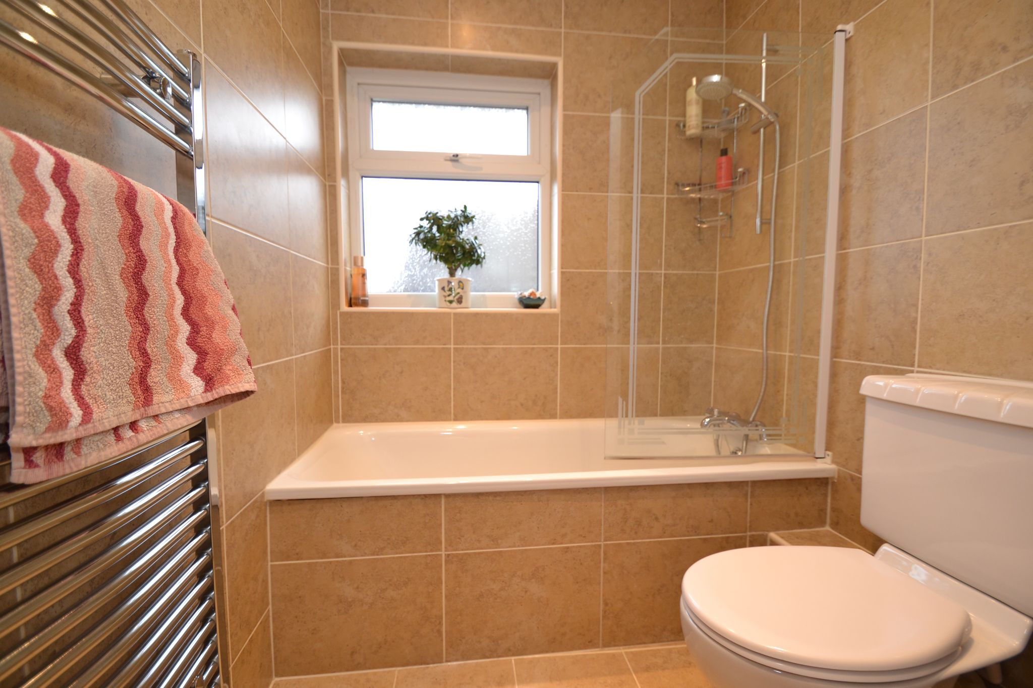 Family Bathroom: Three piece suite in white, chrome fittings with a thermostatically controlled mixer shower tap, glass screen, fully tiled, frosted Upvc dg window, extractor, inset ceiling lights, heated chrome towel rail.