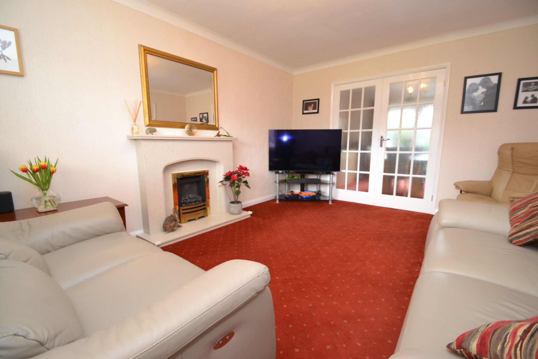 Lounge: Diamond leaded Upvc dg windows to front with a fitted blind, radiator under, marble fireplace with a living flame coal effect gas fire, coving, French doors lead onto the: