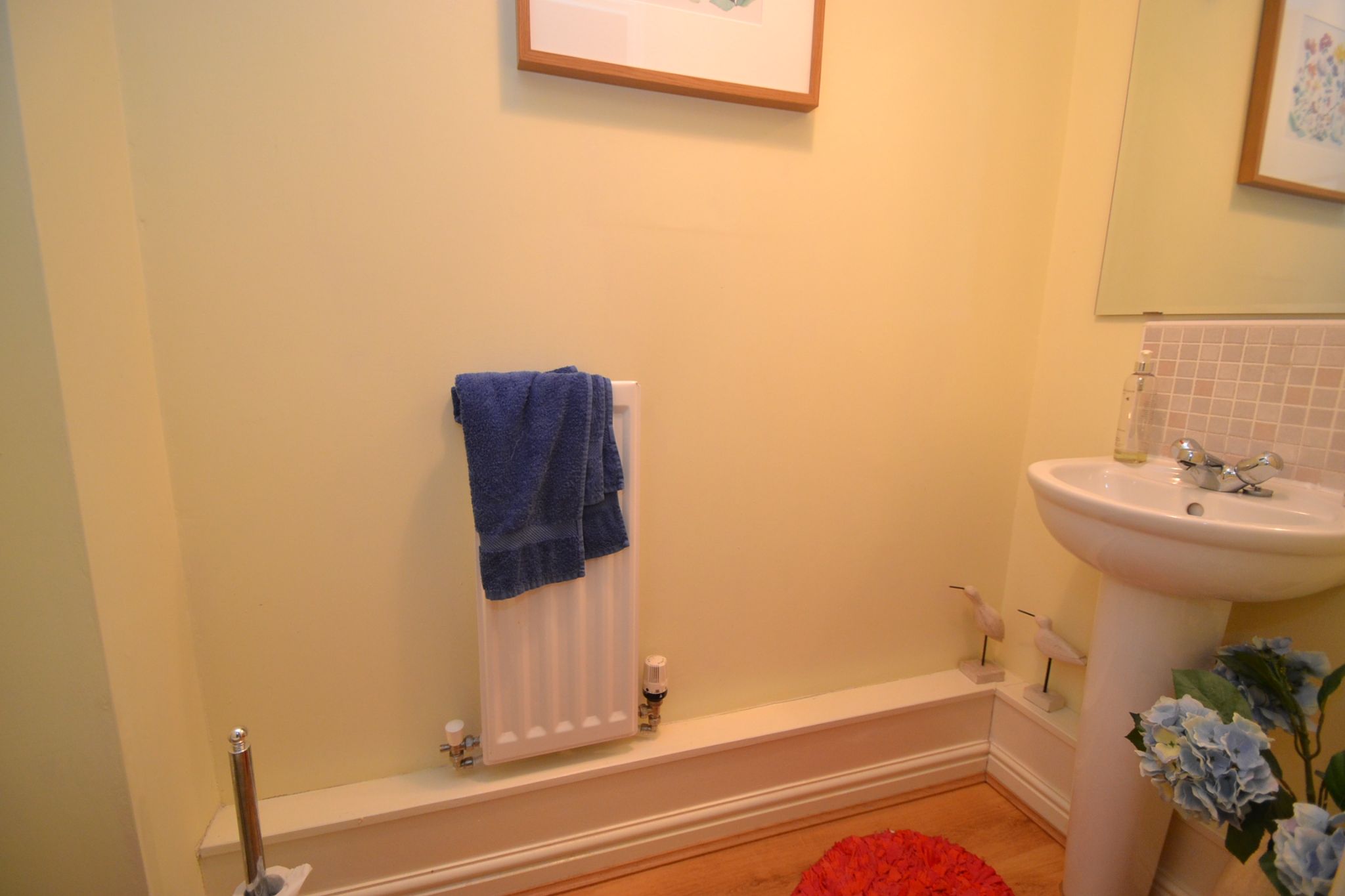Downstairs W.C: Comprising of wash-hand basin and low flush W.C, in white, extractor, radiator, laminate floor.