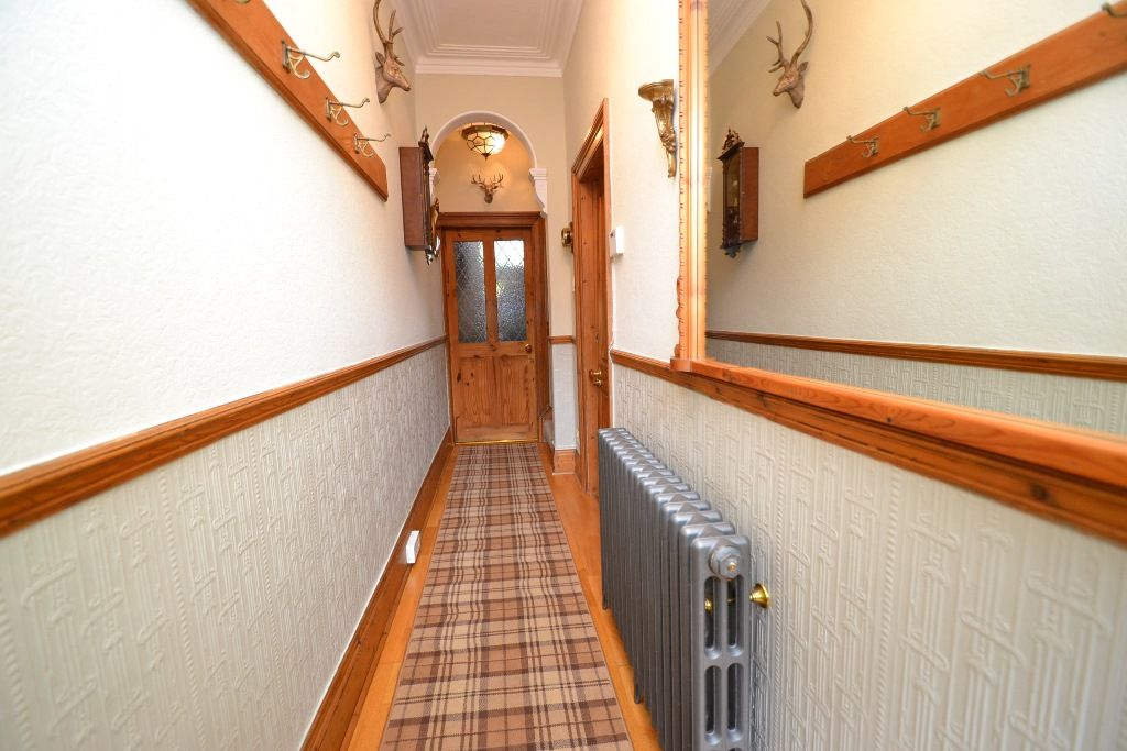 Hallway: Stylish front door into the hallway, laminate floor, school type ch radiator, cornice and ornate plaster work, thermostat control, stained wood features, telephone points.