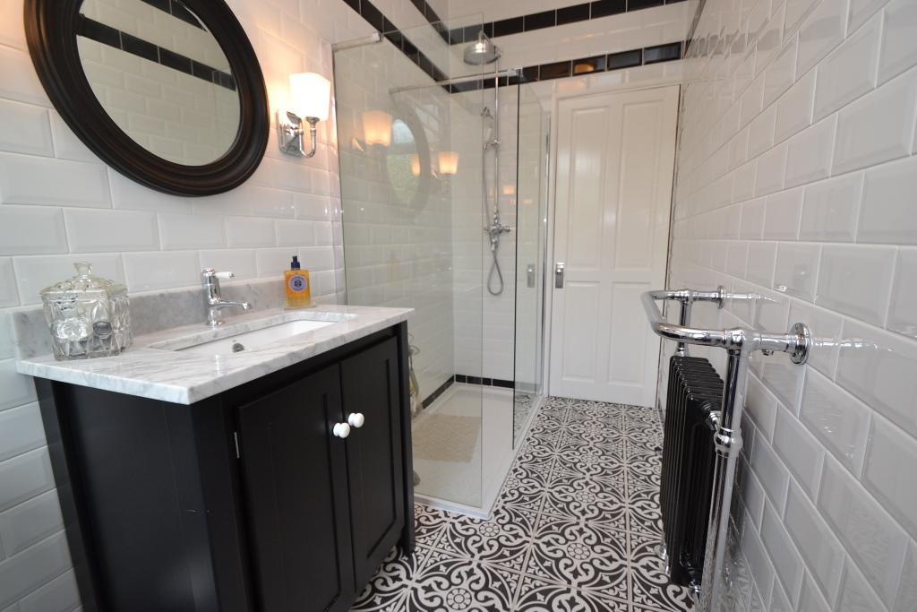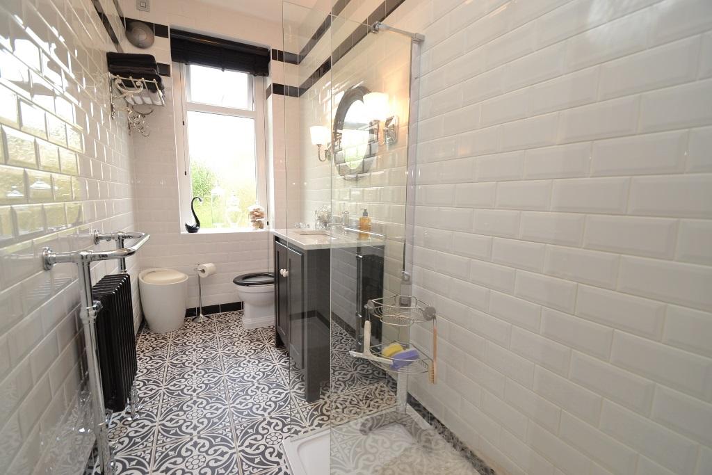 Bathroom: 3.35m x 1.42m (10'11 x 4'7). Superb bathroom suite in white, chrome fittings, white brick tiling with two black contrasting borders and contrasting base border in black, walk in shower cubicle with fixed glass screen, period chrome thermostatically controlled unit and two shower heads one being a rose fixed head and one mobile head, patterned ceramic tiled floor, school type ch radiator with chrome towel rail, hand made bespoke vanity unit with marble top and authentic sink and chrome tap, above are matching expensive upper wall lights, central art deco' ceiling light, frosted Upvc dg window, extractor.