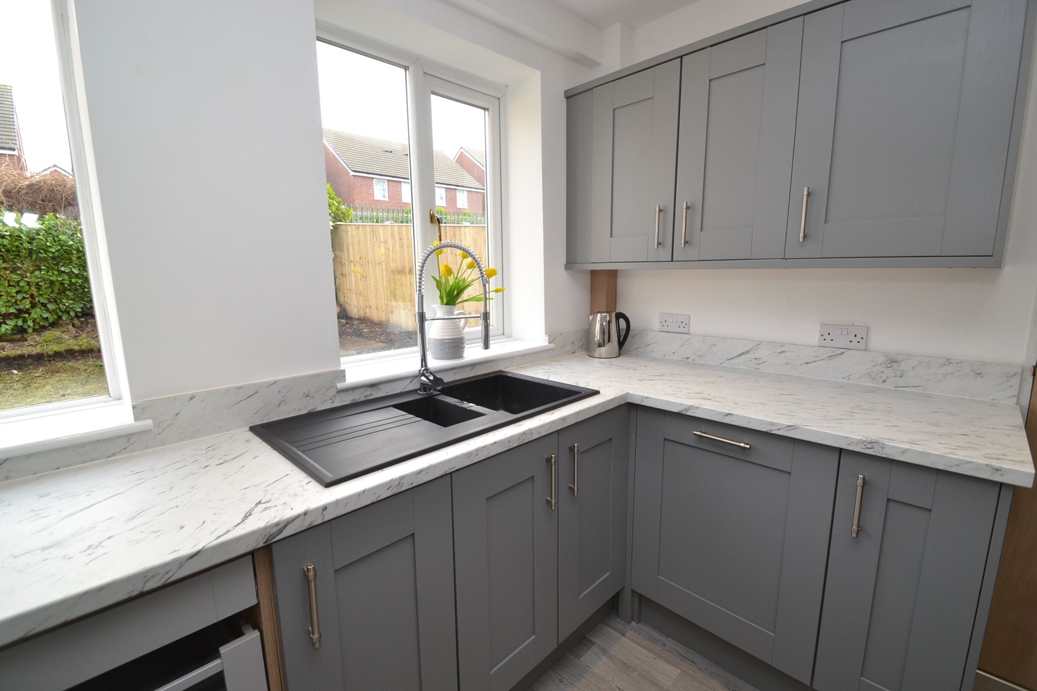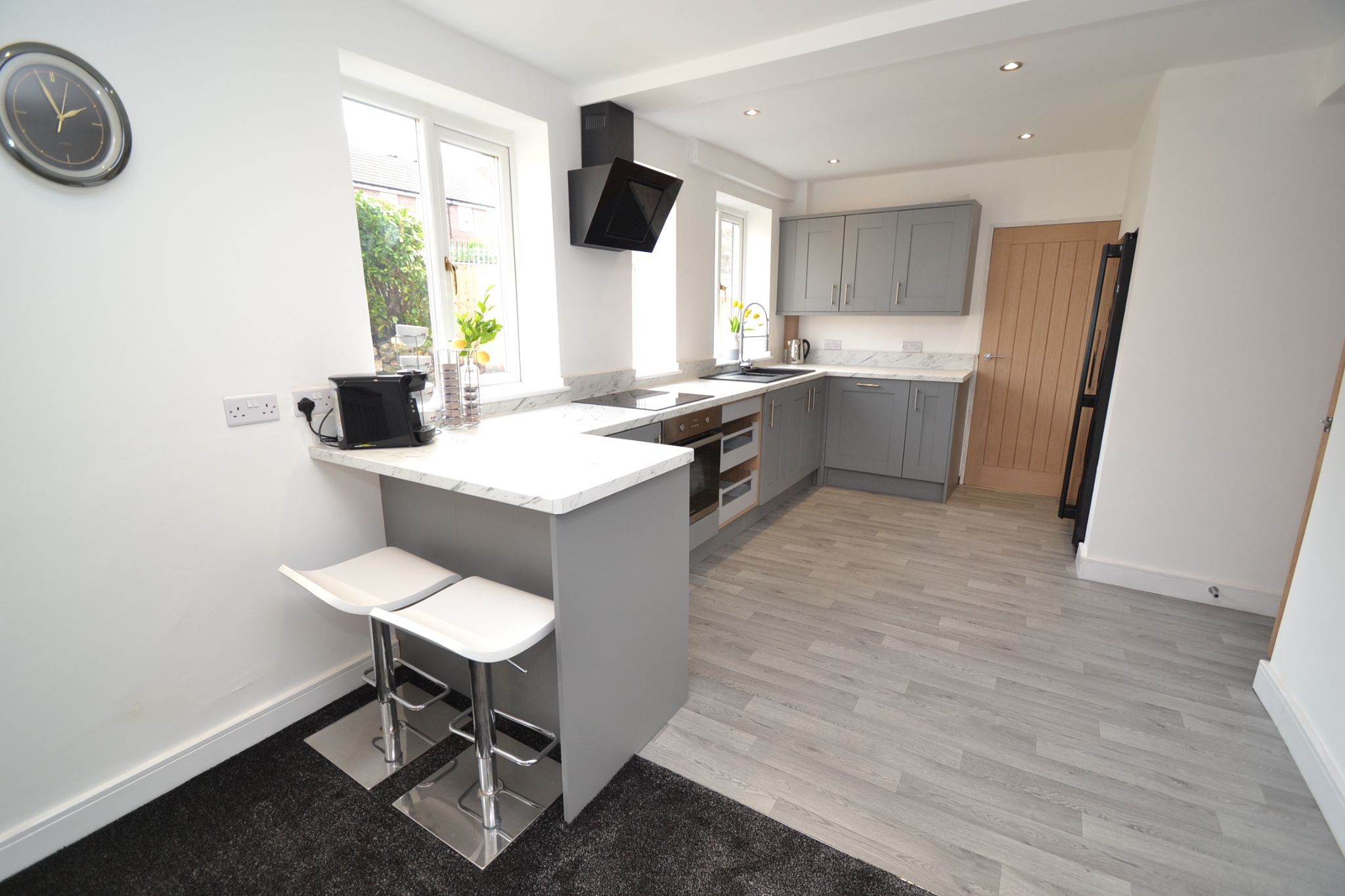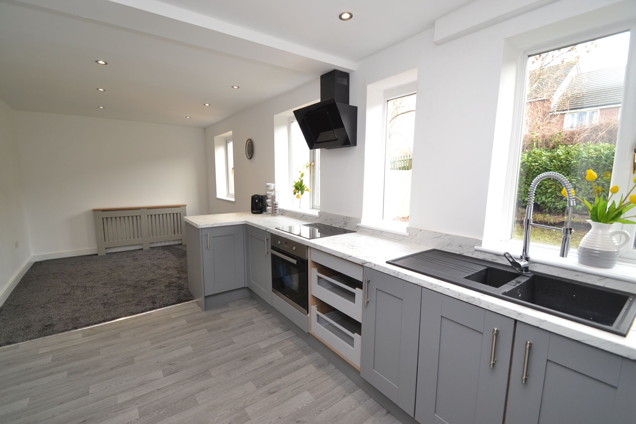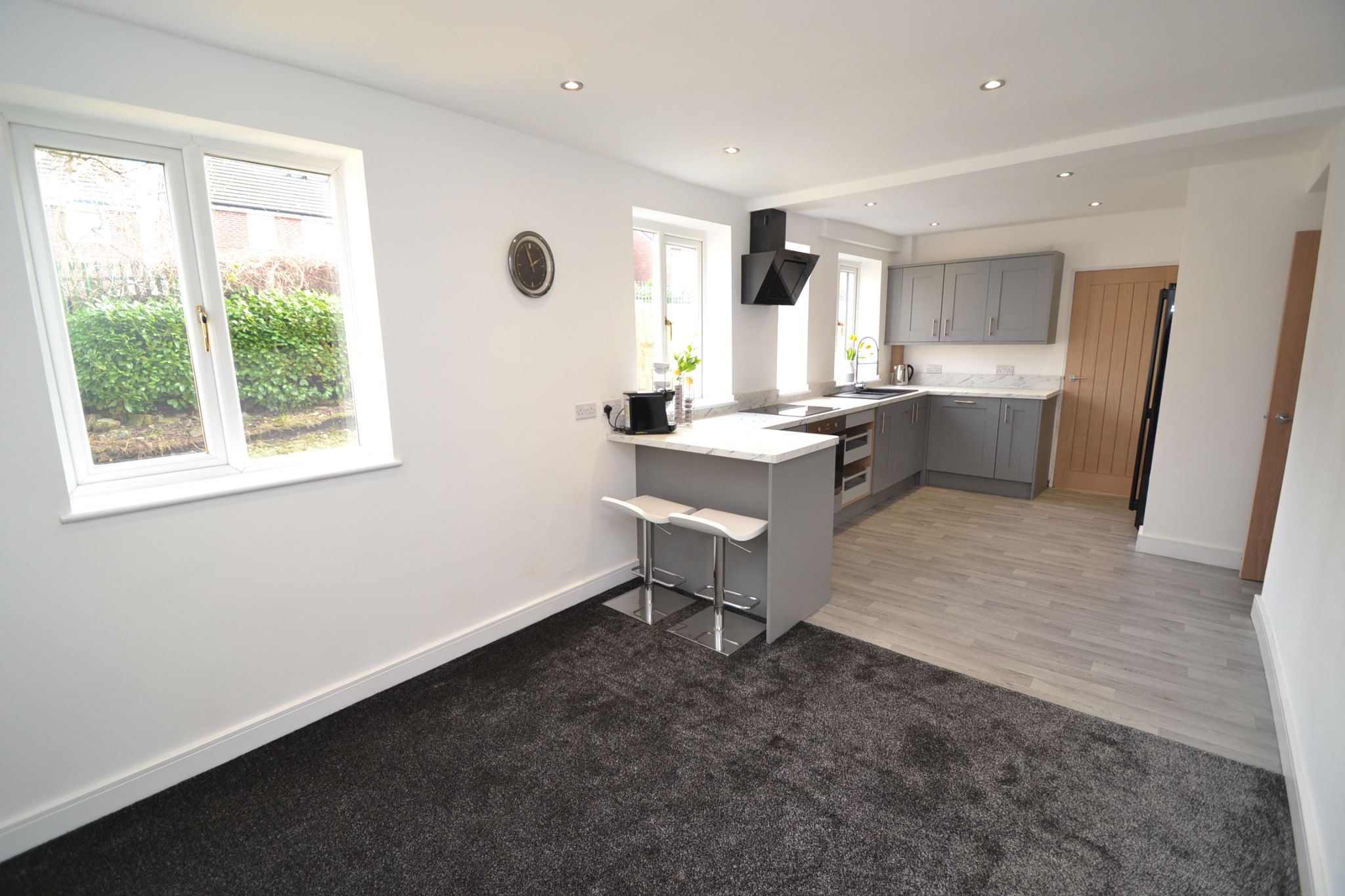 Kitchen Dining Room: Newly installed range of German wall & base units in shaker style in modern grey with stainless steel handles, granite effect work tops with matching splash backs, granite effect sink with point and spray extendable mixer tap, housing for an American style fridge freezer, modern wall glass extractor unit in black over a 4 ring ceramic hob, built in stainless steel electric cooker, breakfast bar, plumbed for a dishwasher, cushion flooring and carpeted to the dining area. Four Upvc dg windows offer a bright and airy kitchen dining experience, inset chrome ceiling lights on a dimmer control. In the dining area, space for a table and chairs.