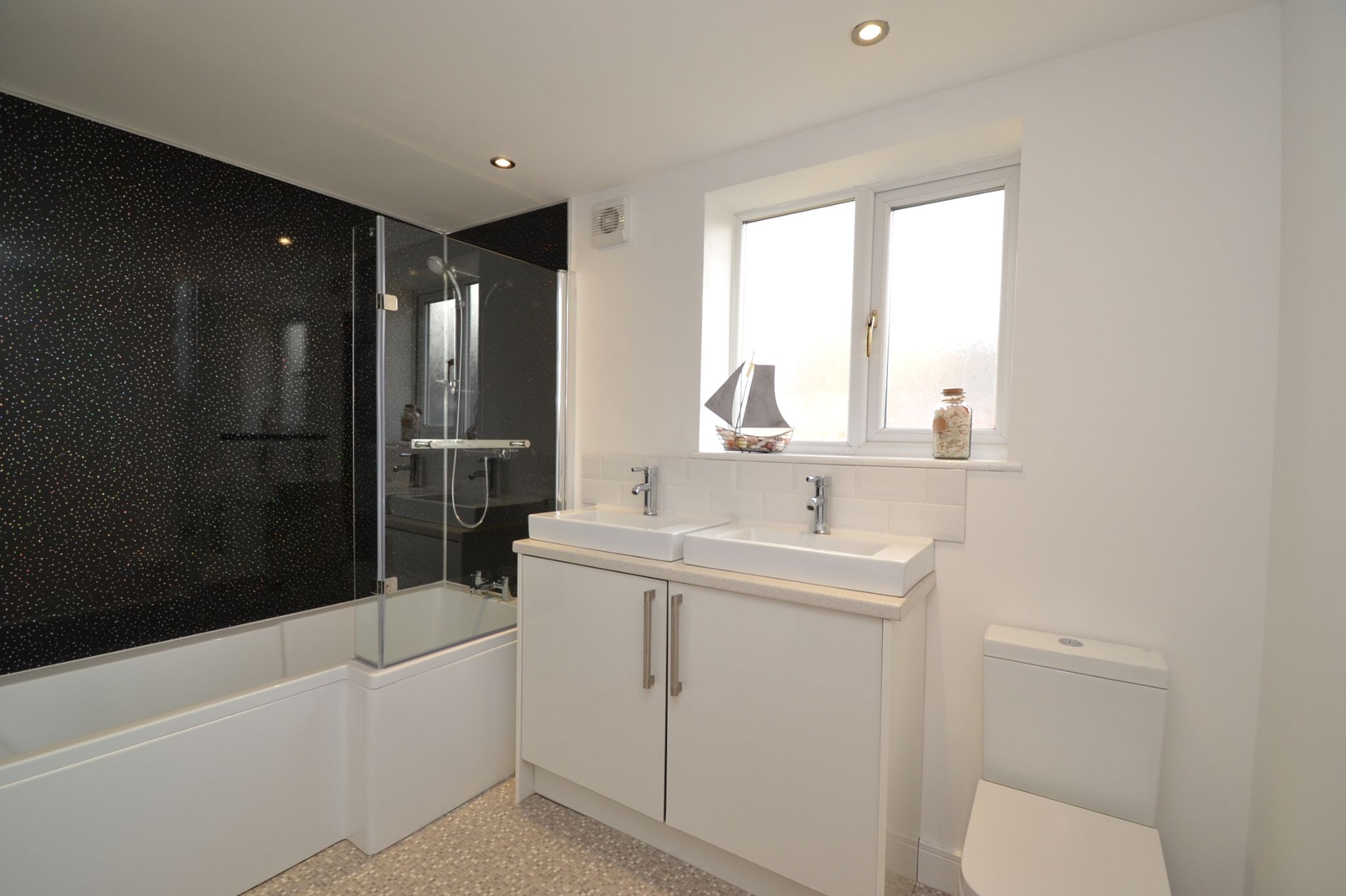 Bathroom: 2.92m x 1.87m (9'5 x 6.1). Newly installed three piece 'P' shaped suite in white, shower screen, sparkling cladded splash back, chrome mixer tap, and chrome thermostatically controlled shower unit, extractor, frosted Upvc dg window, contemporary radiator, his and hers wash basins on a base vanity unit, inset chrome ceiling lights.