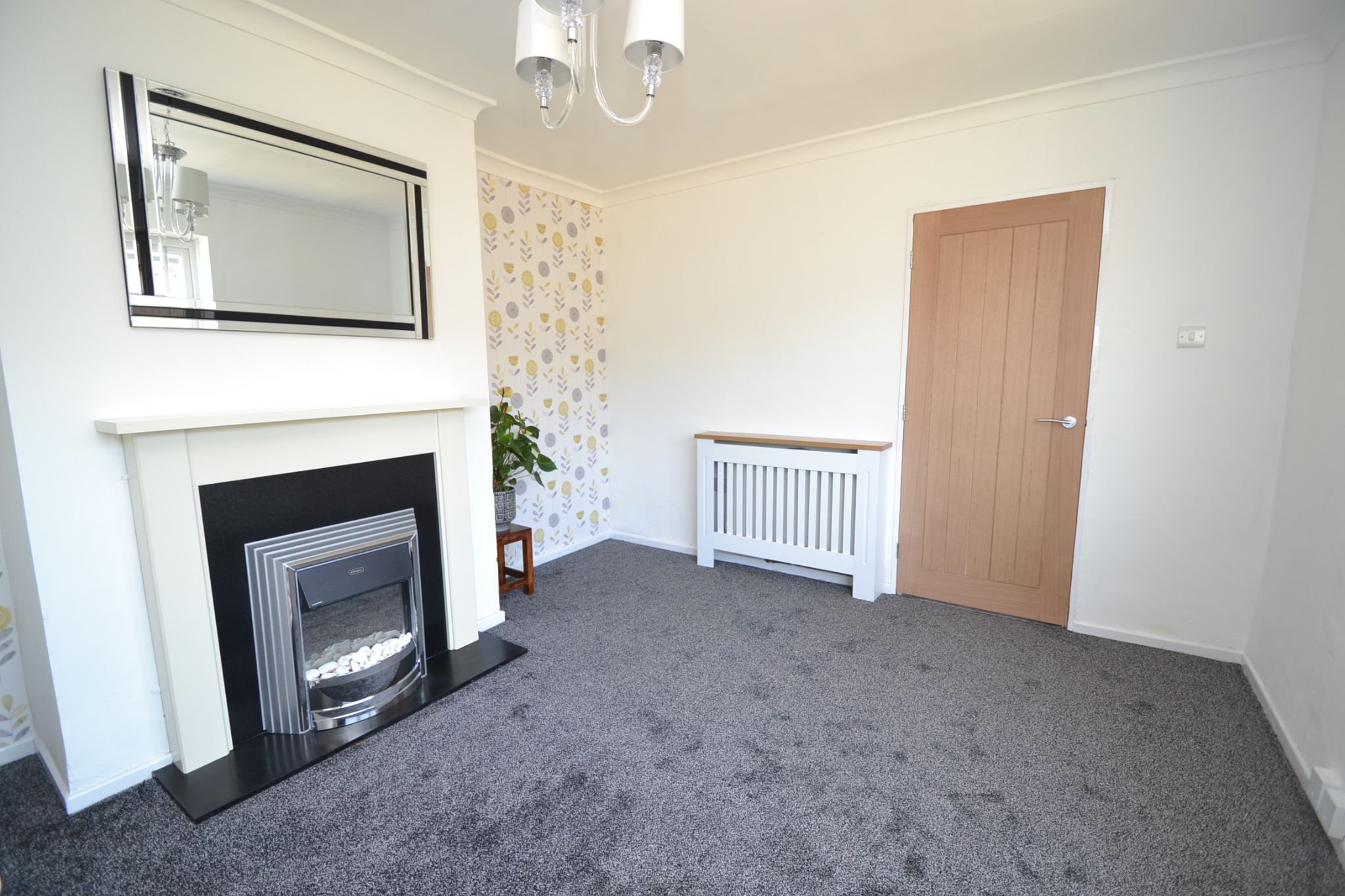 Lounge: Front Upvc dg window, radiator, fireplace surround with granite effect back & hearth with an electric pebble Dimplex fire, coving.