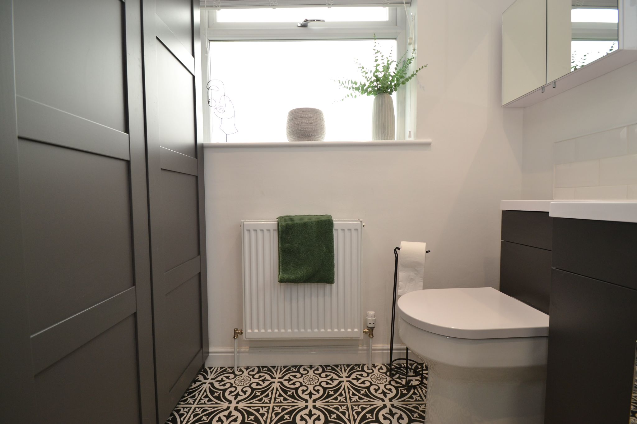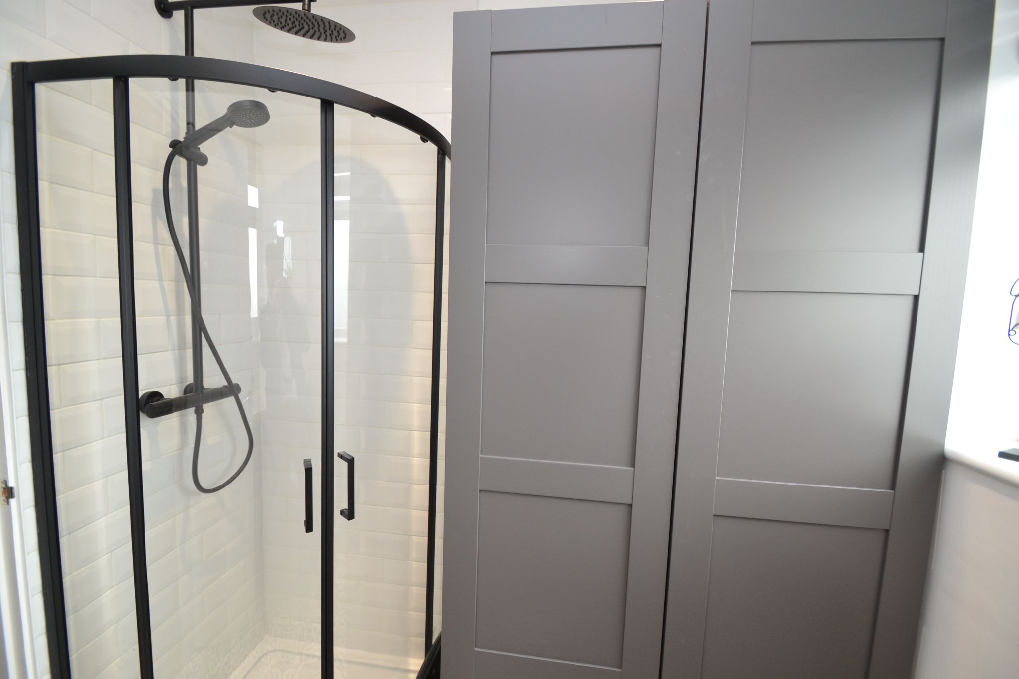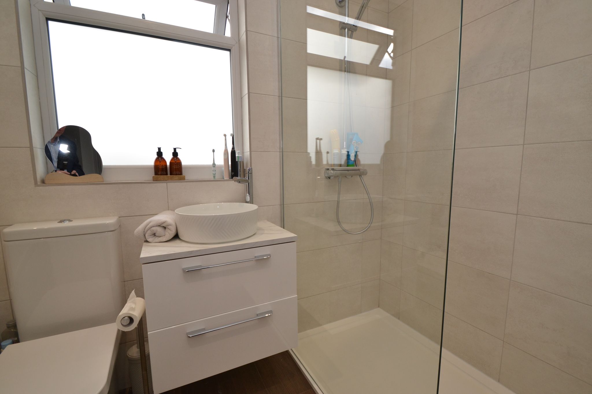 Shower Room: 2.28m x 1.91m. Two Upvc dg windows, radiator, wash basin and wc in an enclosed cistern and vanity unit, cupboard, fully tiled wrap around shower cubicle with a sleek modern black finish, black rain head thermostatically controlled unit with a hand attachment, inset ceiling lights.
