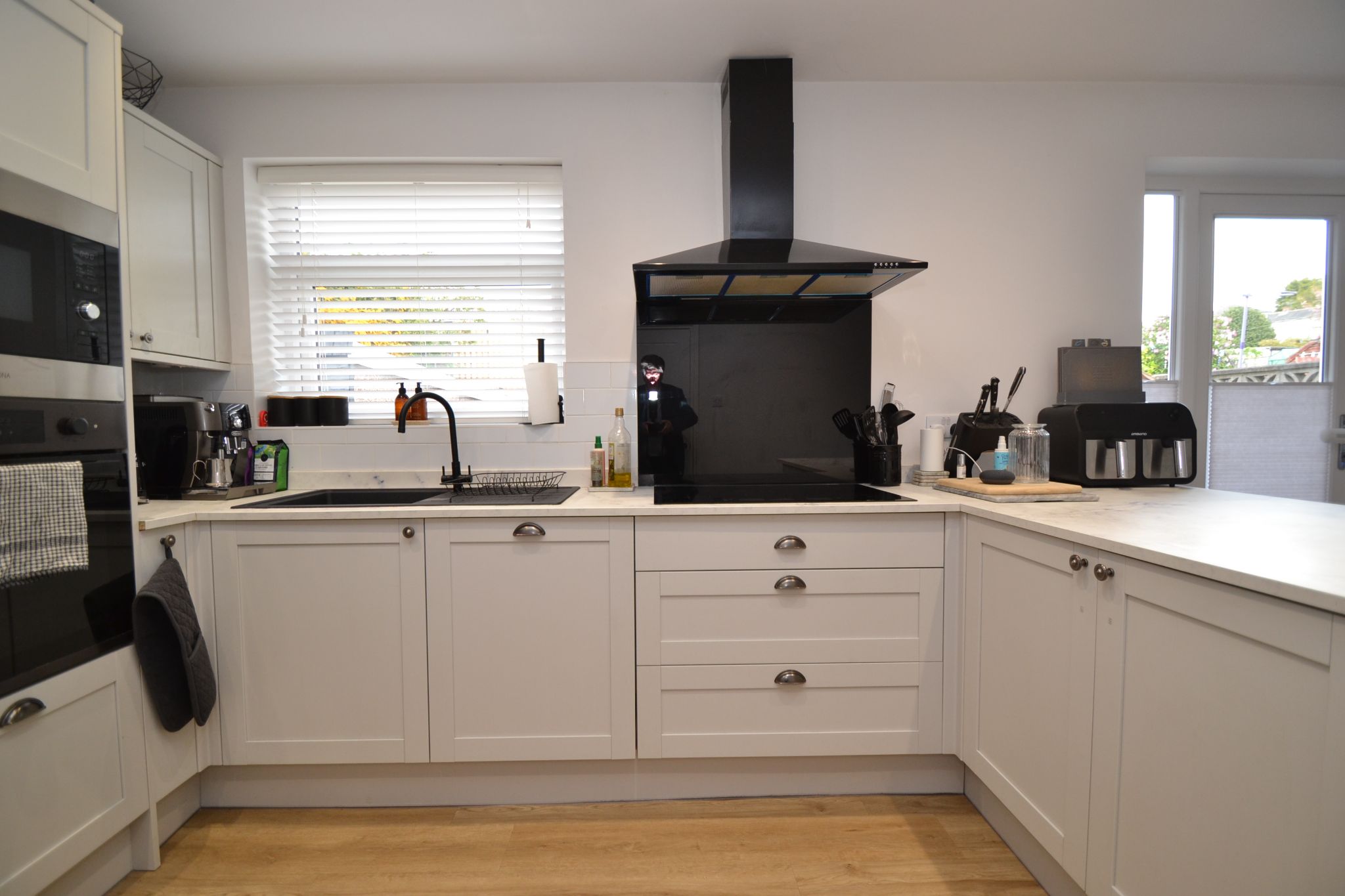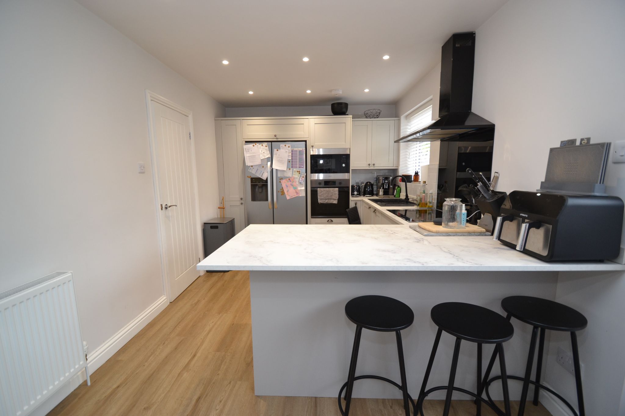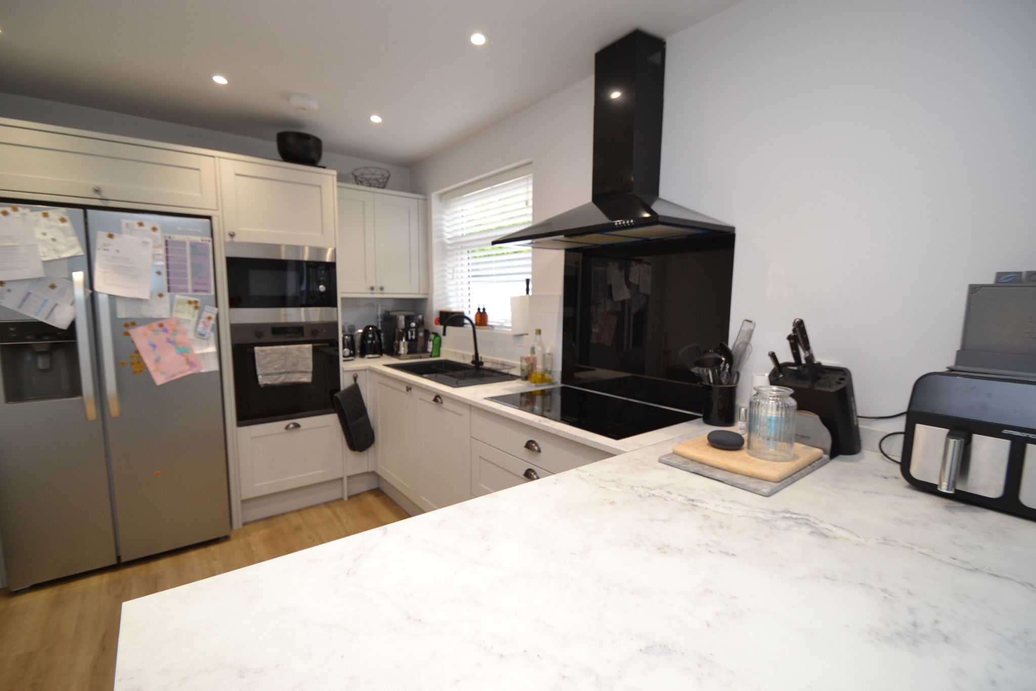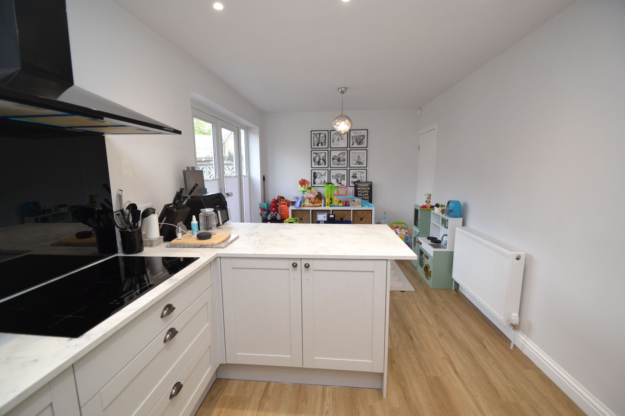 Open Plan Kitchen Diner: 6.38m x 2.82m (20'9 x 9'2). In the dining area are Upvc dg French doors with inset blinds to the rear leading out to the decked patio, radiator, laminate flooring, useful under stairs cupboard. To the kitchen are a range of wall & base units, glacier marble effect work tops with matching splash backs and in part white brick effect tiling, integrated dishwasher, black stainless steel extractor and light hood over a 5 ring ceramic hob, glass splash back, sink in graphite effect with a mixer tap, Upvc dg window with a fitted blind, built in microwave oven and  built in electric oven, space for an American style fridge freezer, inset ceiling lights.
