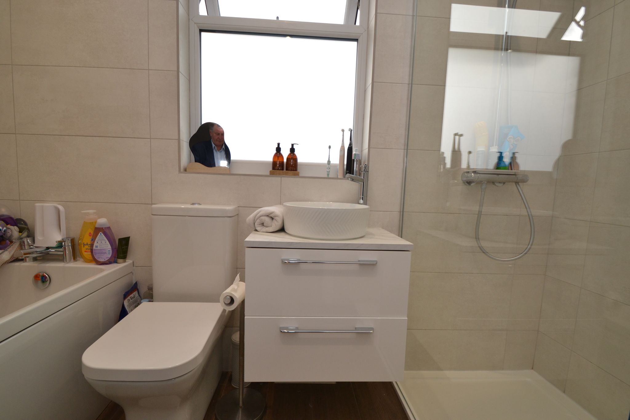 Bathroom: Four piece suite in white, bath with a chrome mixer tap, circular wash basin set on a vanity base unit, wc, fully tiled, separate walk in shower cubicle with a chrome thermostatically shower unit with a rain head and hand attachment, heated chrome towel rail, extractor, inset ceiling lights.