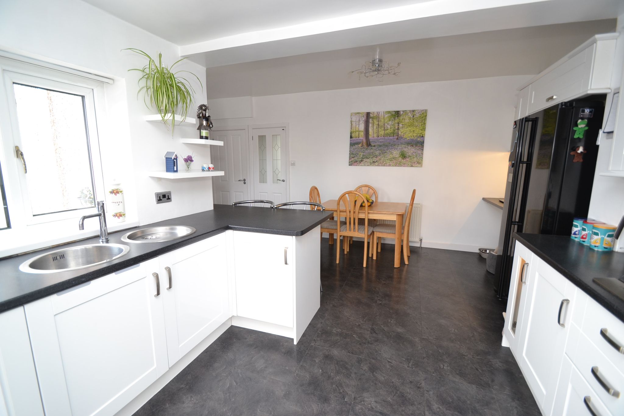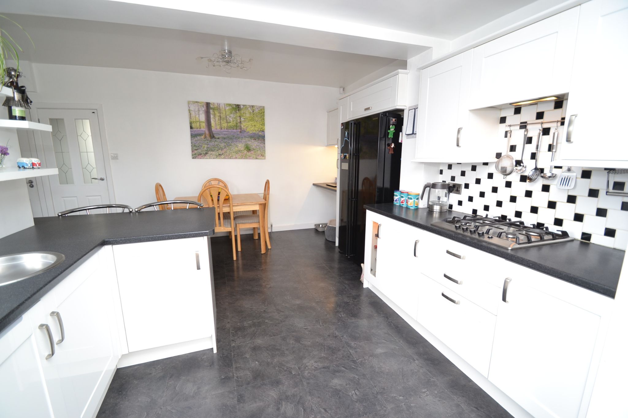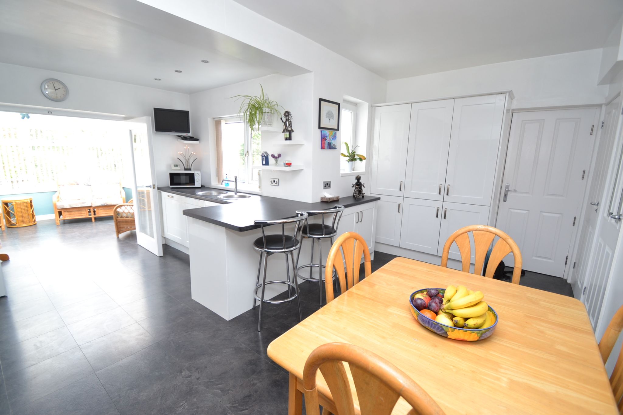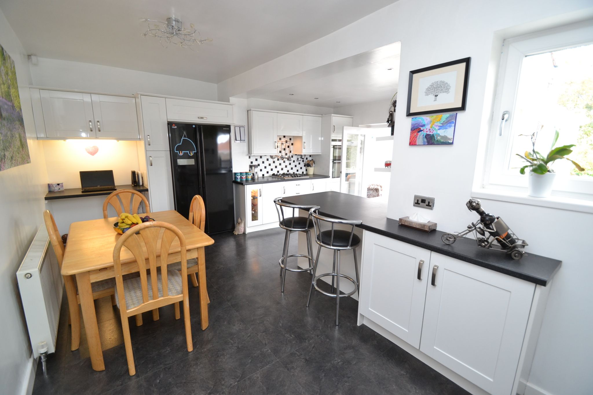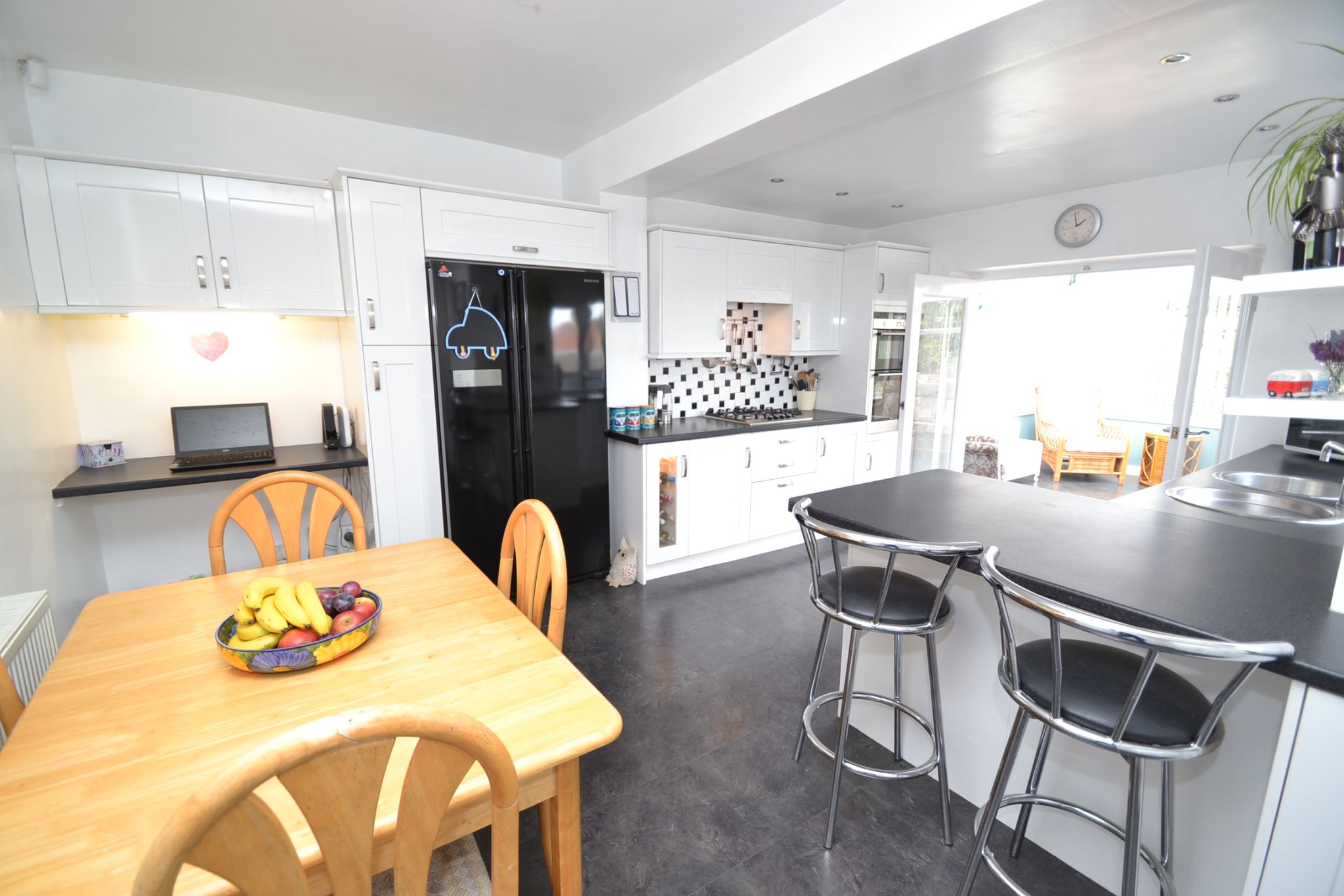 Extended Open Plan Kitchen Dining Room: 5.40m x 5.00m (17'7 x 16'4). Extensive fitted range of wall & base units in high gloss white, work tops, extractor and light over a 4 ring stainless steel gas hob by Bosch, double fittted electric oven, pull out larder cupboard, integrated dishwasher, breakfast bar, stainless steel bowl sink and matching drainer with a mixer tap, inset chrome ceiling lights, space for a dining table and chairs, slate effect tiled floor in laminate, radiator, rear French doors lead onto the:-