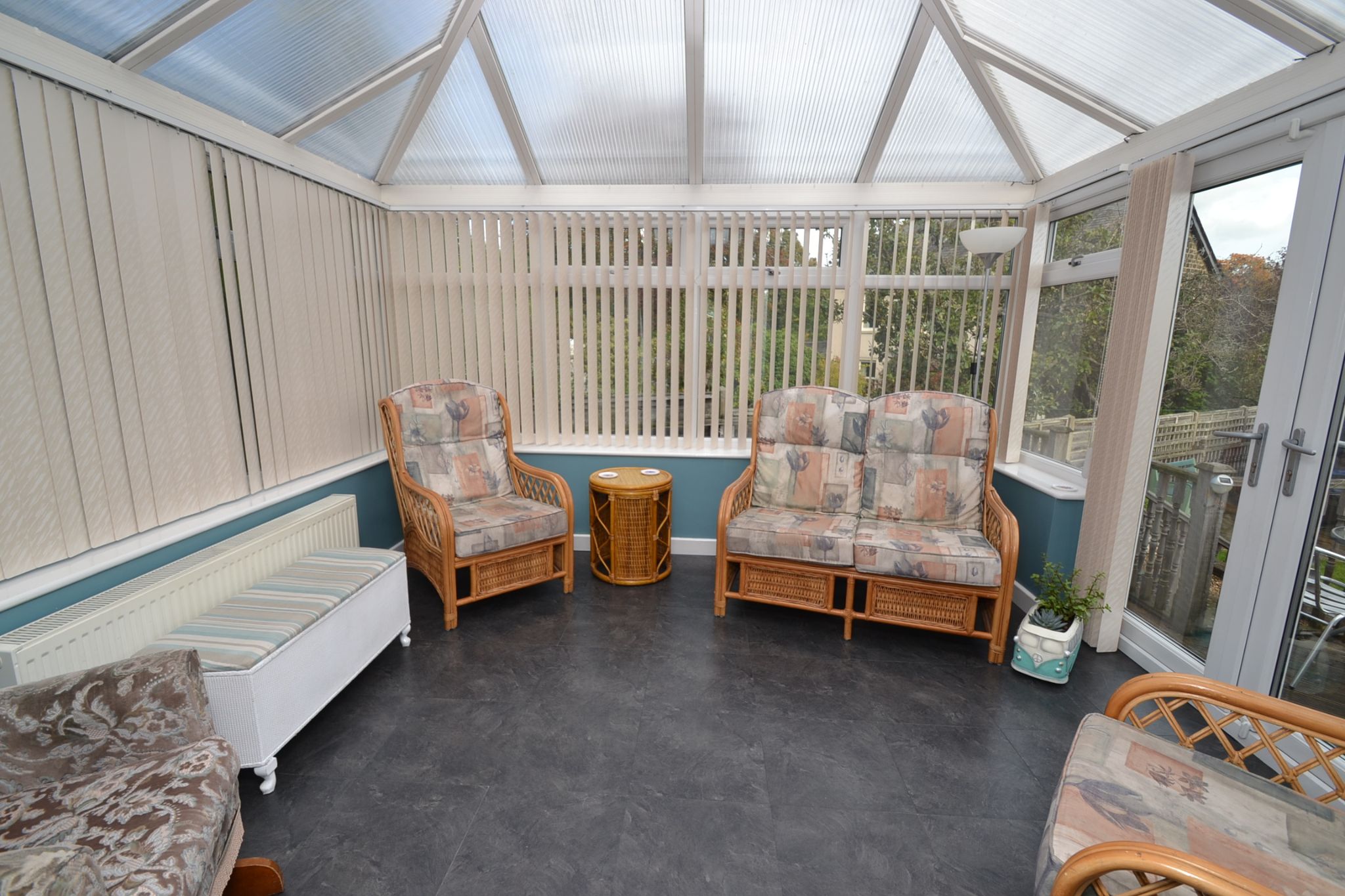 Upvc dg Conservatory: 3.3m x 3.1 (10'8 x 10'1). Side French doors, radiator, pitched roof, slate effect tiled laminate floor, fitted blinds.