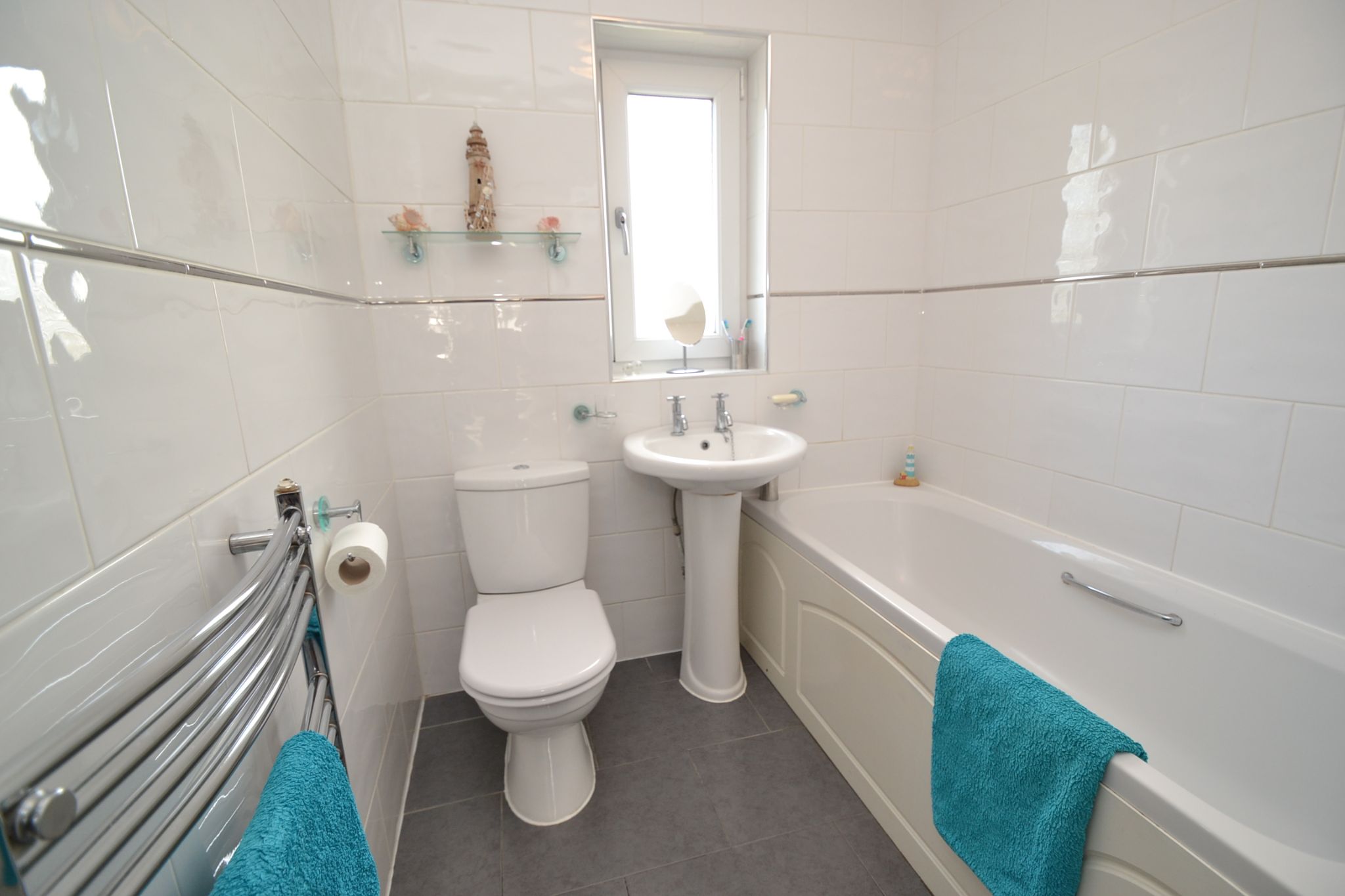 Family Bathroom: 2.31m x 1.79m (7'5 x 5'8). Three piece suite in white, fully tiled, chrome thermostatically controlled shower unit over the bath, ceramic tiled floor, frosted Upvc dg window with a fitted blind, heated chrome towel rail, useful linen cupboard.