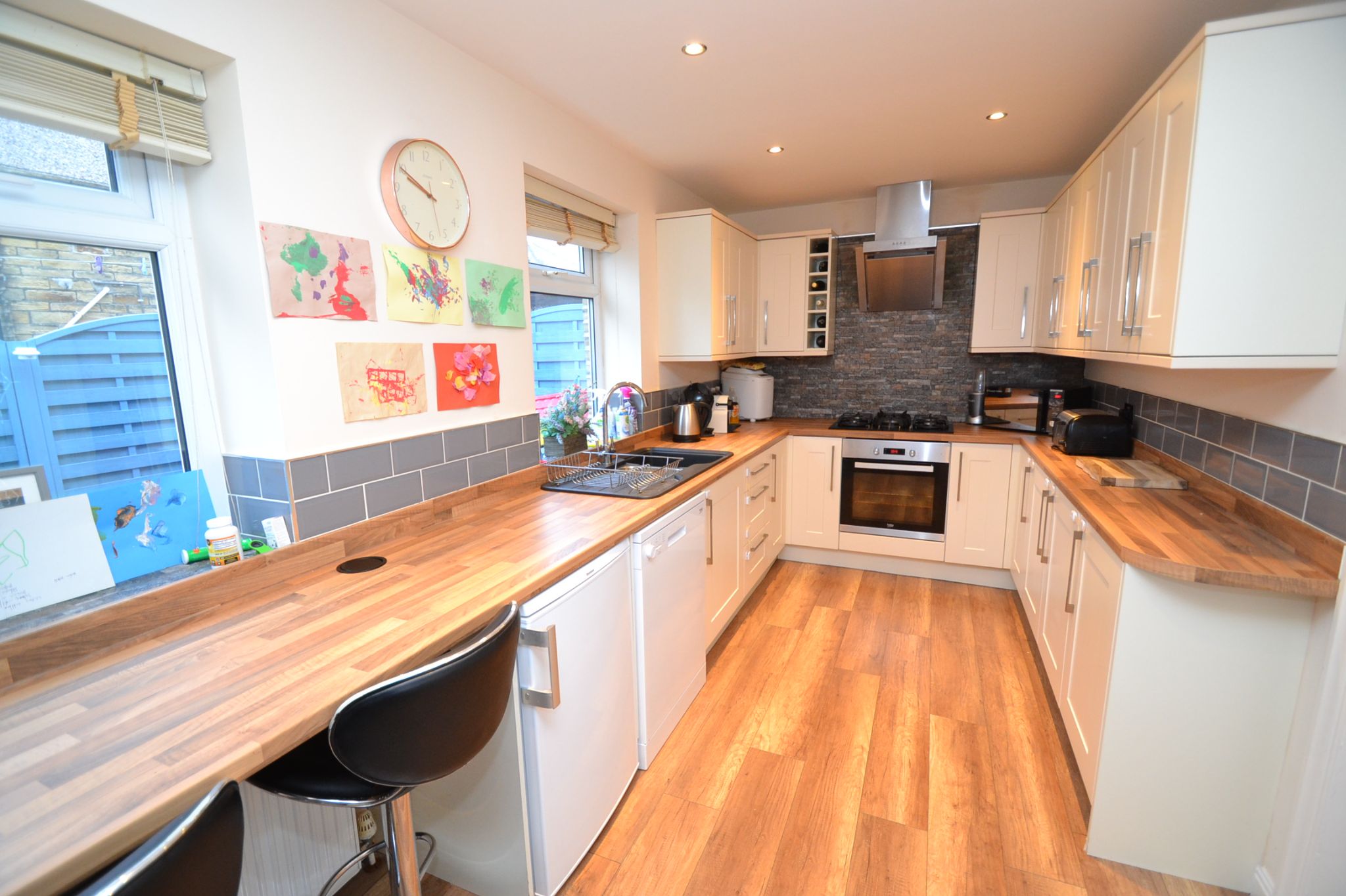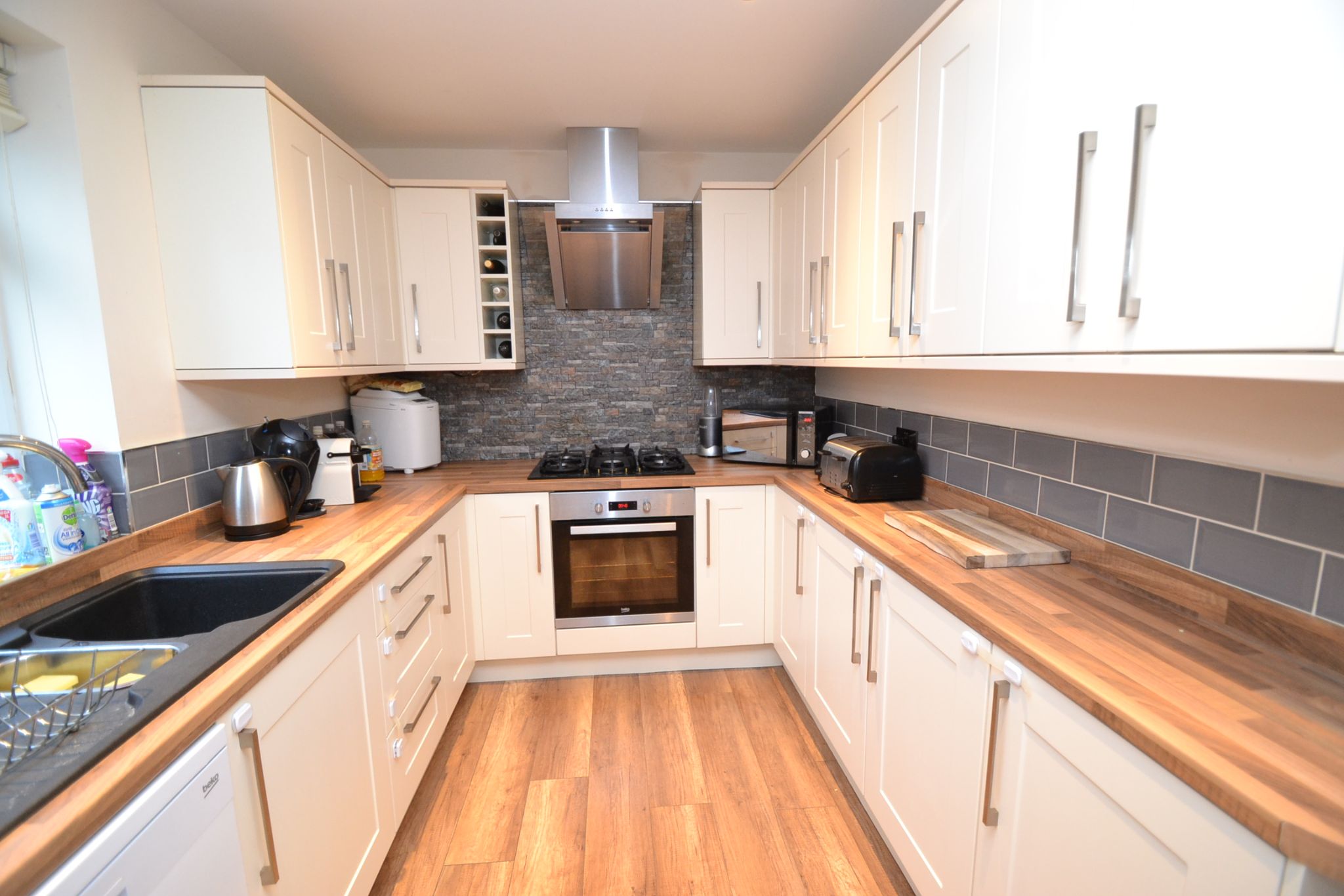 Kitchen: 4.59m x 2.29m (15'0 x 7'6). Extensive range of wall & base fitted units over walnut effect work tops and matching splash backs, stainless steel power and plug points, contemporary stainless steel extractor hood with light, 5 ring gas stainless steel hob, built in gas cooker, integrated fridge, plumbed for a dishwasher, inset chrome ceiling lights, breakfast bar, ch radiator, oak effect plank laminate flooring, pantry cupboard.