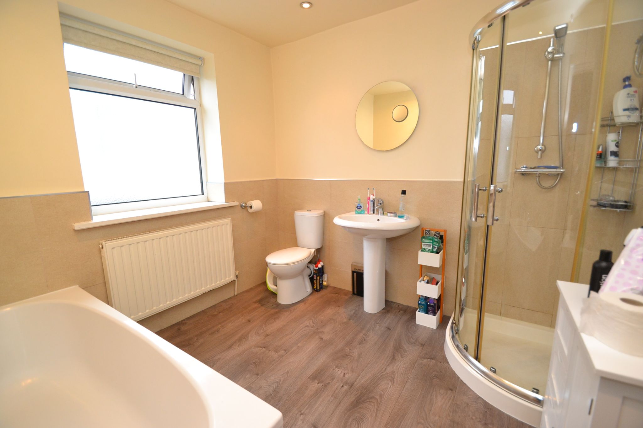 Bathroom: 2.83m x 2.64m (9'3 x 8'7). Four piece suite comprising warp around shower cubicle with chrome thermostatically contolled shower unit, bathroom and wc along with wash basin in white, chrome fittings, part tiled, frosted Upvc dg window, ch radiator, inset chrome ceiling lights.