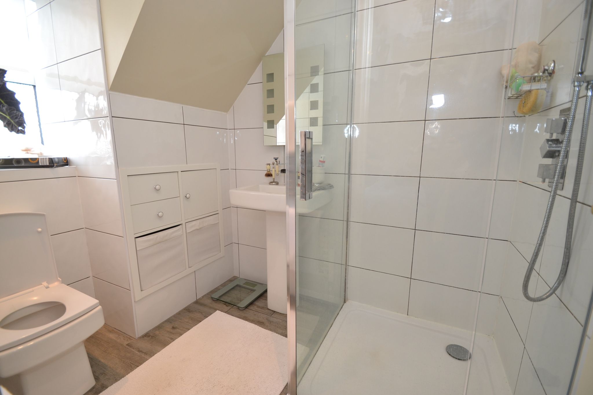 En-Suite: 2.48m x 1.73m (8'2 x 5'8). Fully tiled shower cubicle with a chrome thermostatically controlled shower unit, wash basin and wc in white, Upvc dg dormer window, inset ceiling lights, extractor, fully tiled, useful linen cupboard storage.