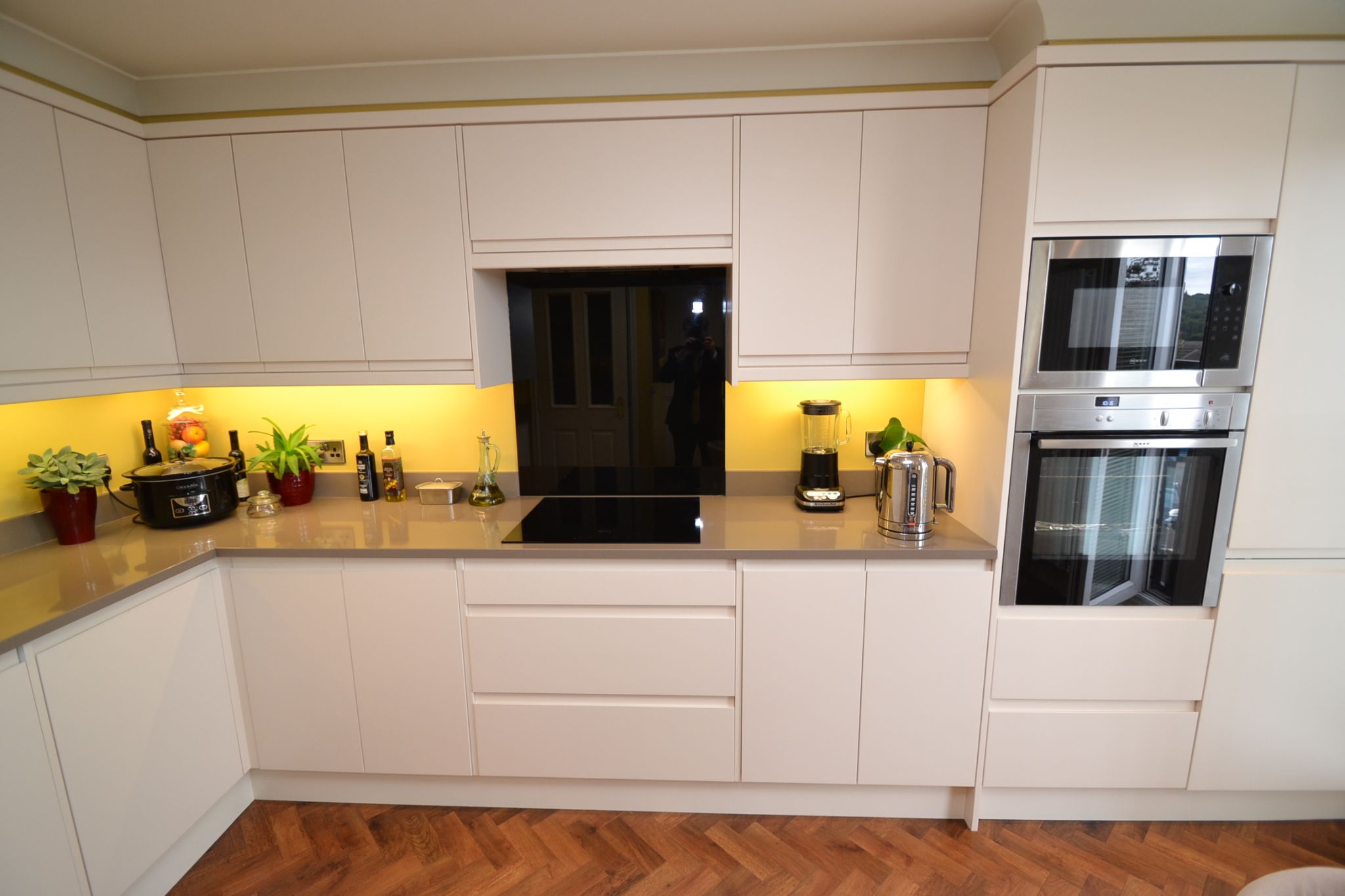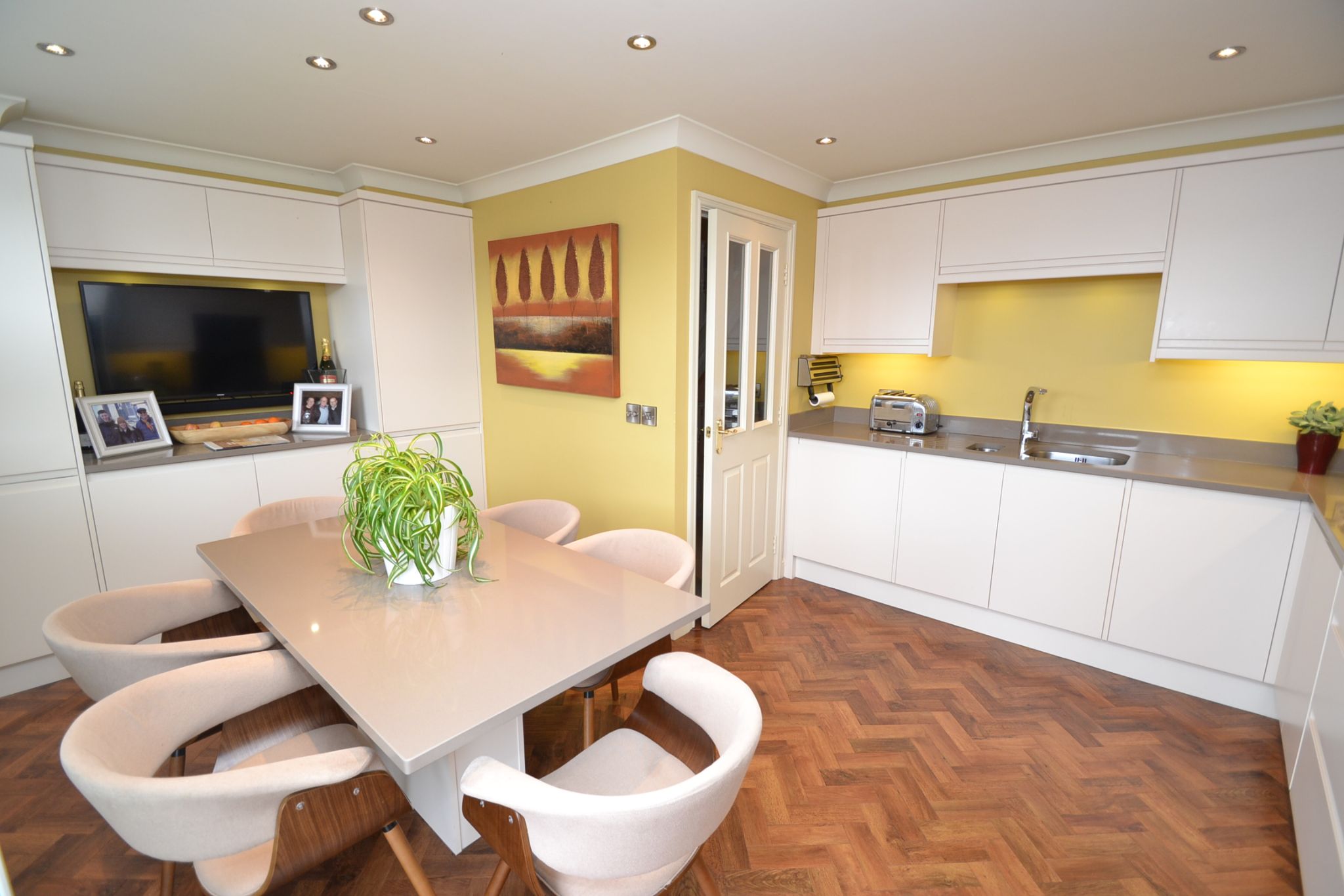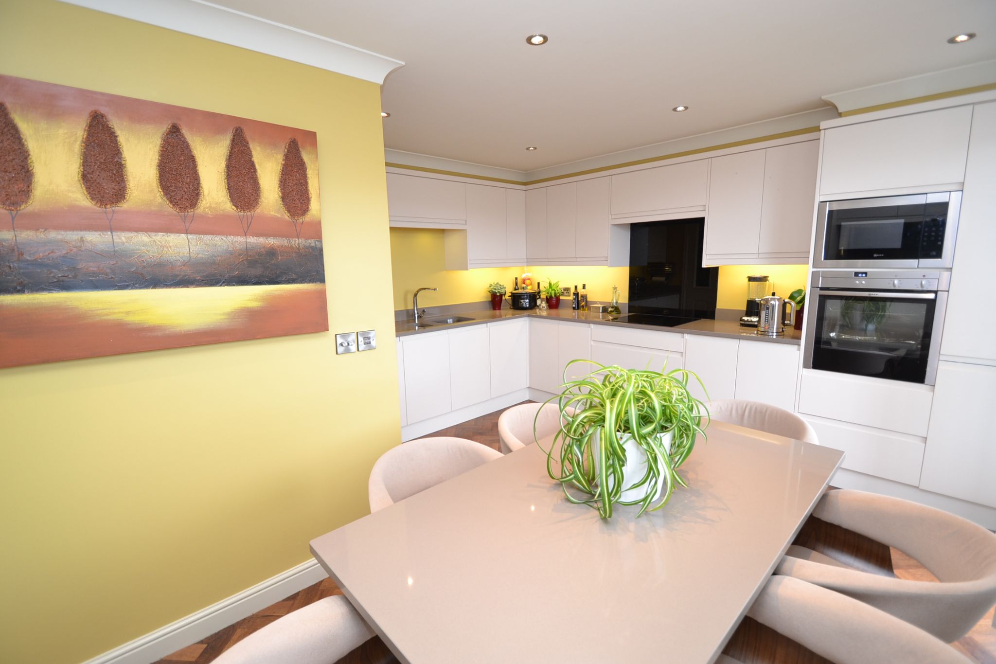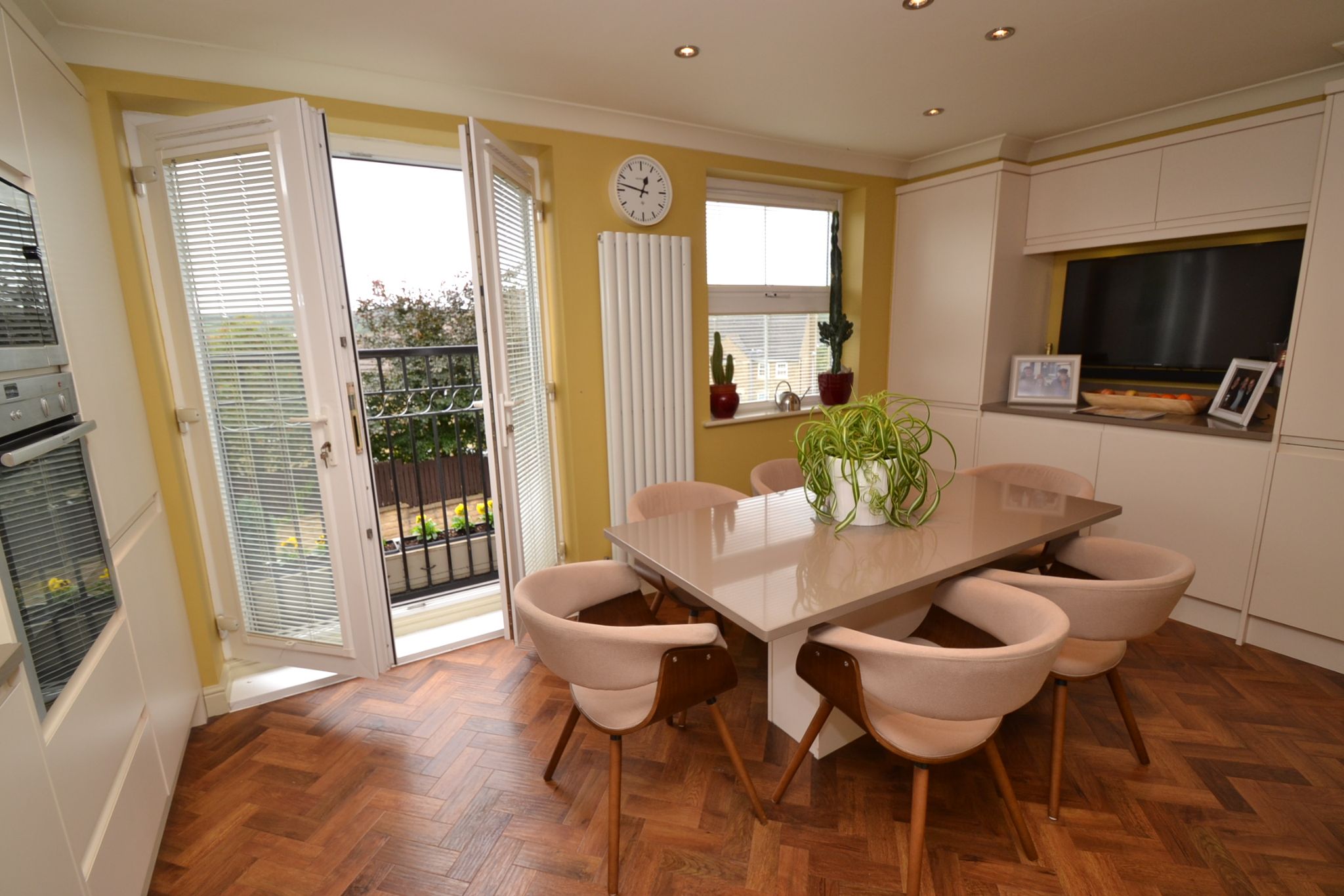 Kitchen Diner: 4.90m x 4.14m (16'1 x 13'7). Extensive range of wall & base units, work tops with matching splash backs and under lighting, extractor and light over an induction hob and glass splash back, built in microwave and electric oven fan assist oven by Neff, integrated fridge freezer, integrated Electrolux dishwasher, inset stainless sink with drainer and mixer tap, space for a table and chairs, Upvc dg French doors onto a Juliettte balcony and front Upvc dg window, coving, inset ceiling lights, column upright radiator.