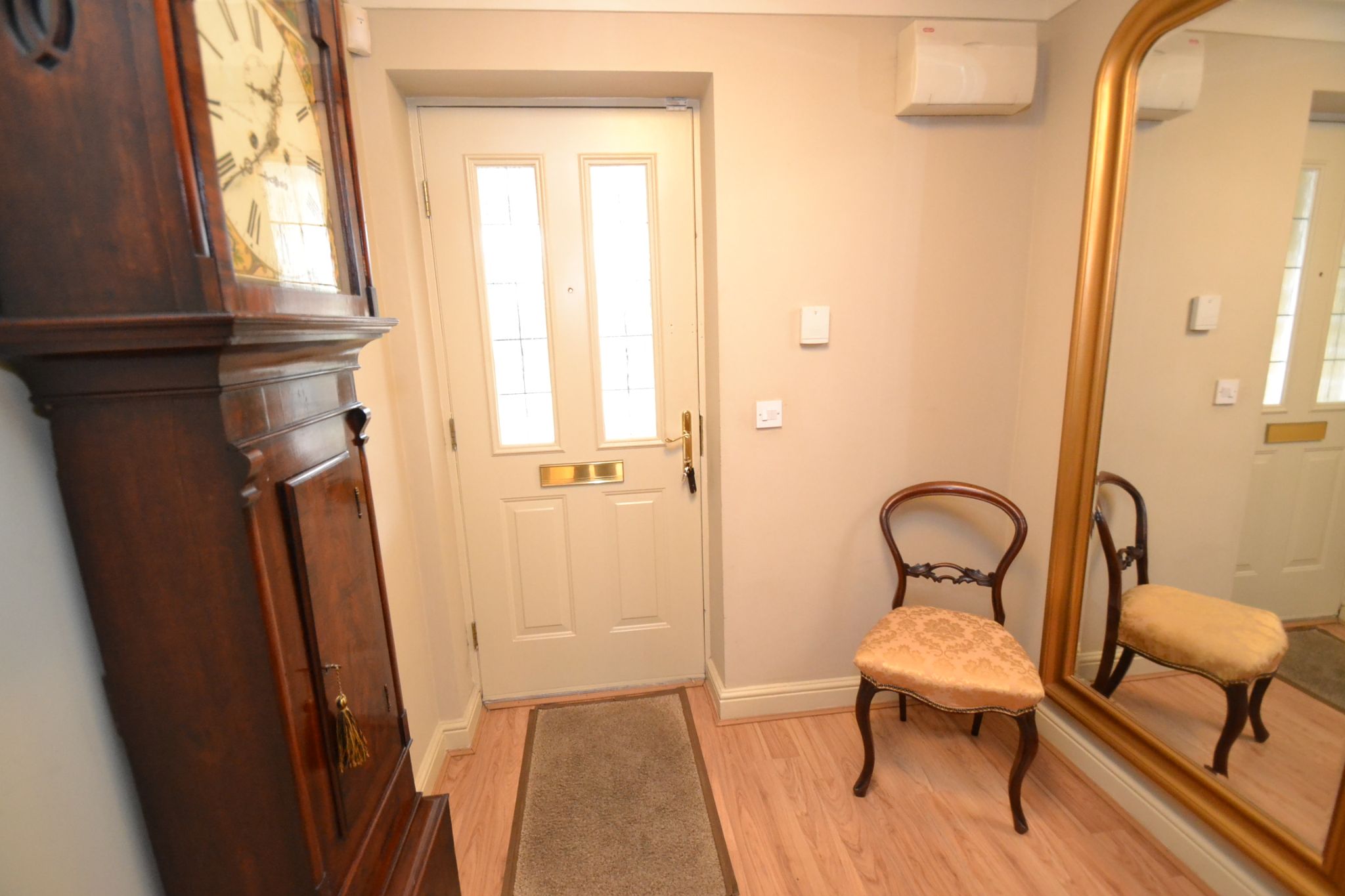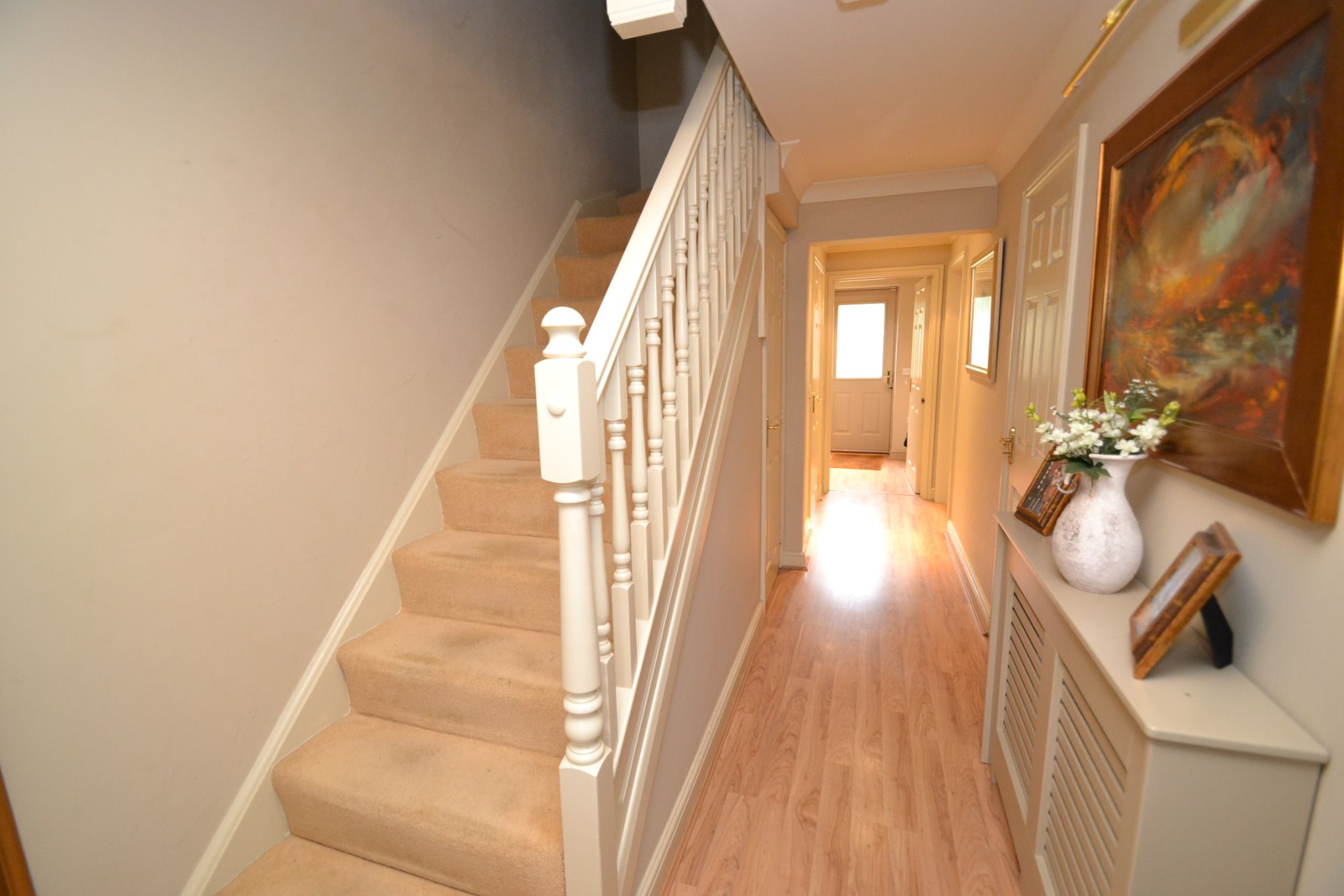 Ground floor entrance: Entrance door into the hallway, stairs, radiator, laminate flooring, alarm panel, coving, useful coats storage cupboard.