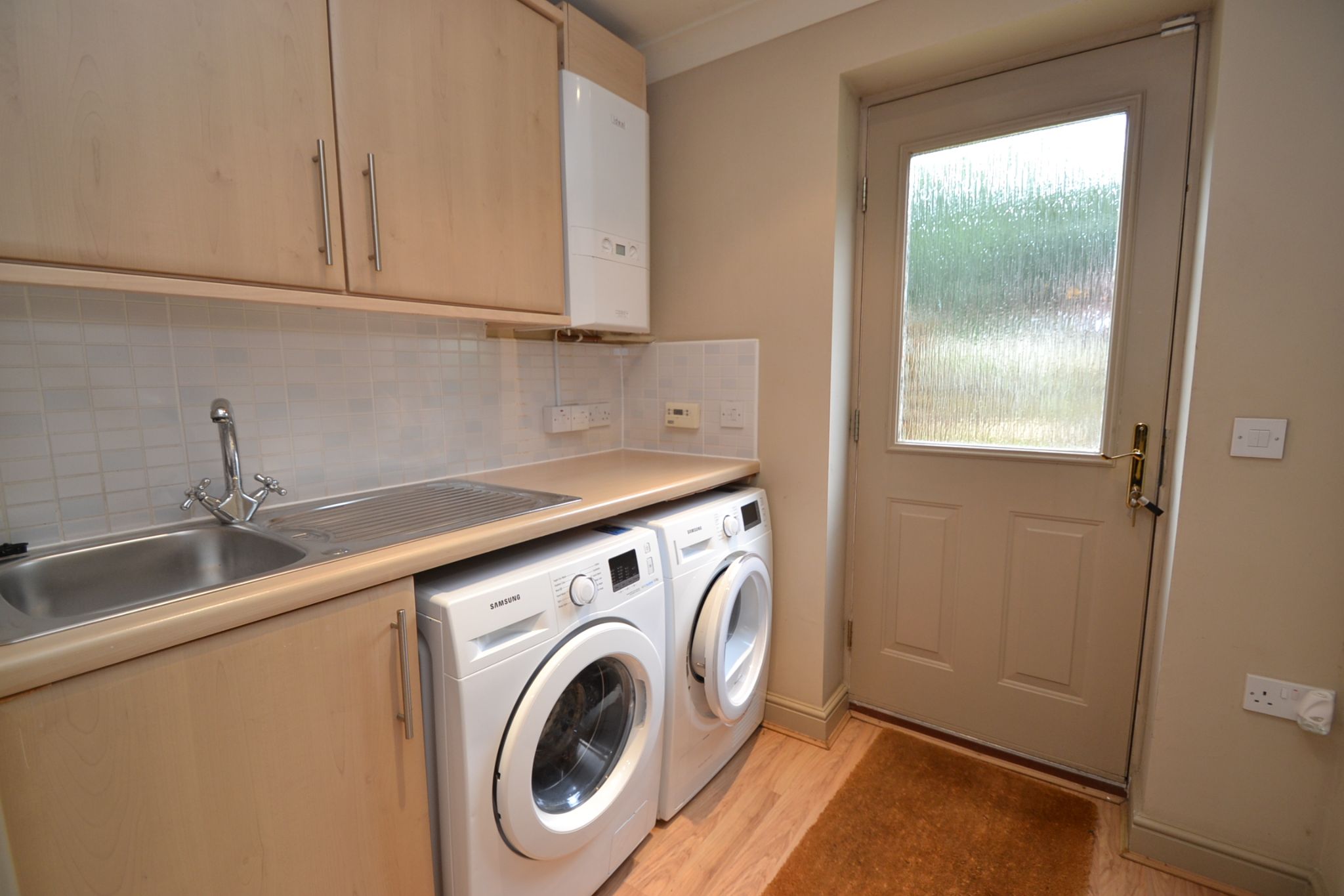 Utility Room: 2.08m x 1.83m (6'10 x 6'0). Range of wall & base units, stainless steel sink, plumbed for an auto-washer and dryer, laminate floor, radiator, rear entrance door, extractor, inset ceiling lights, wall mounted Ideal Logic heat 18 boiler.