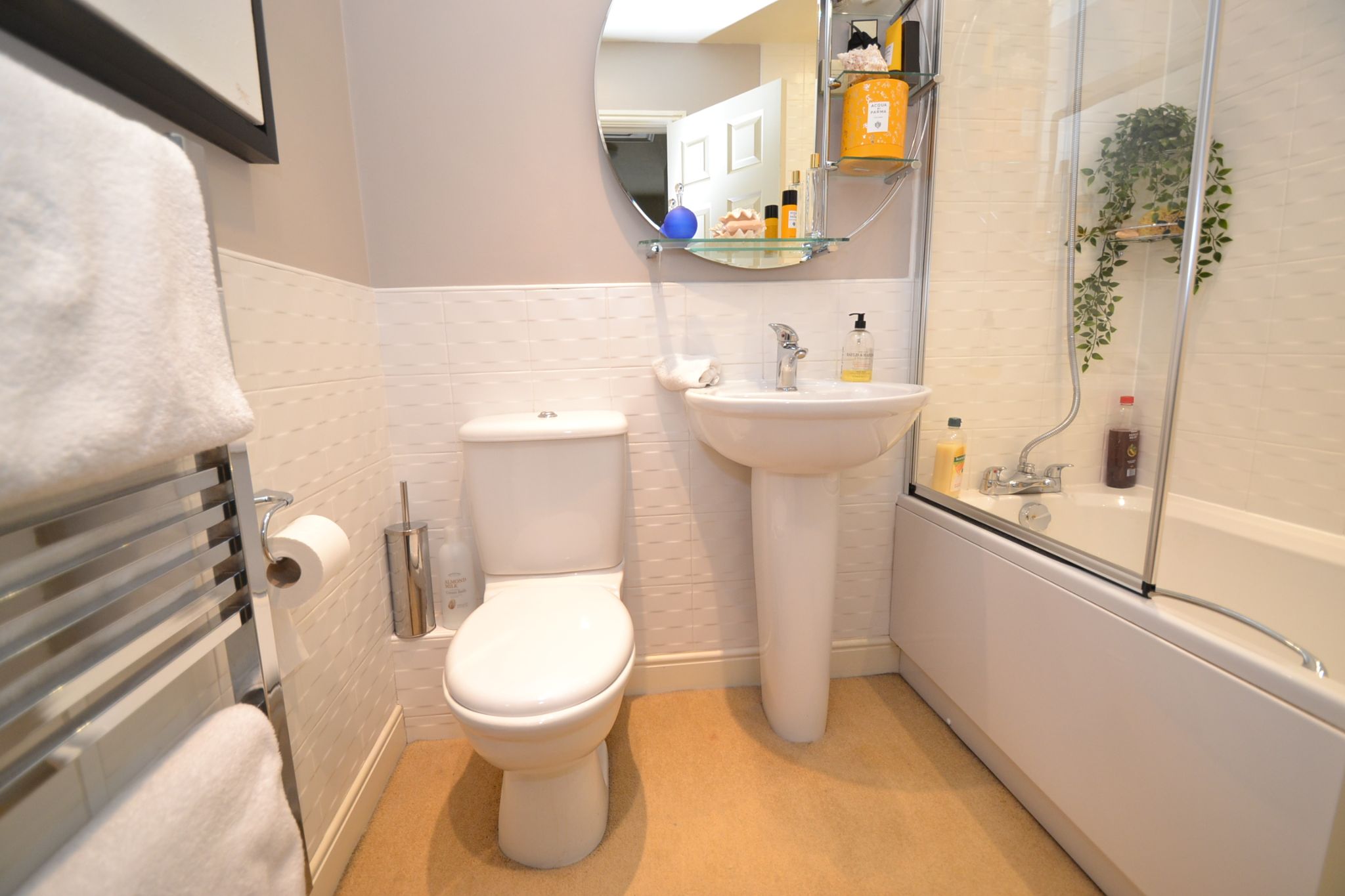 Family Bathroom: 2.08m x 1.68m (6'10 x 5'6). Three piece suite in white, chrome fittings, part tiled, shower screen with a mixer tap, heated chrome towel rail, inset ceilling lights, extractor.