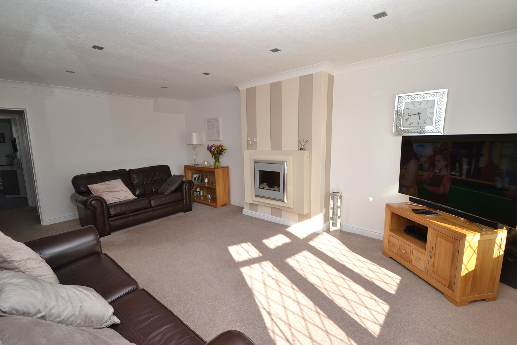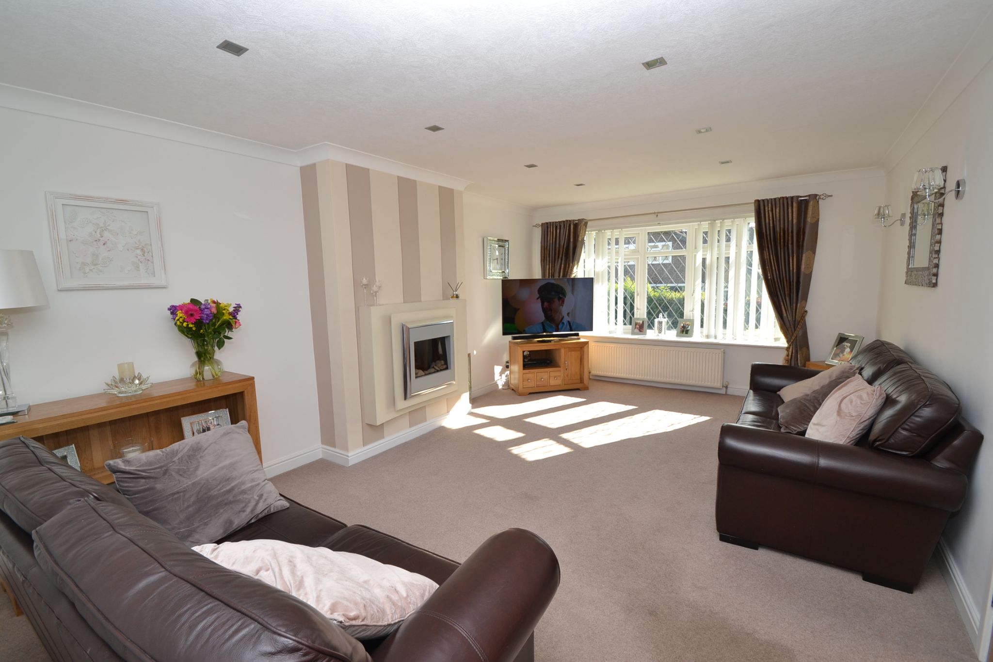 Lounge: Upvc dg diamond leaded bay window to front, radiator, coving, contemporary ceiling lights, feature pebble wall mounted gas fire, thermostat control.
