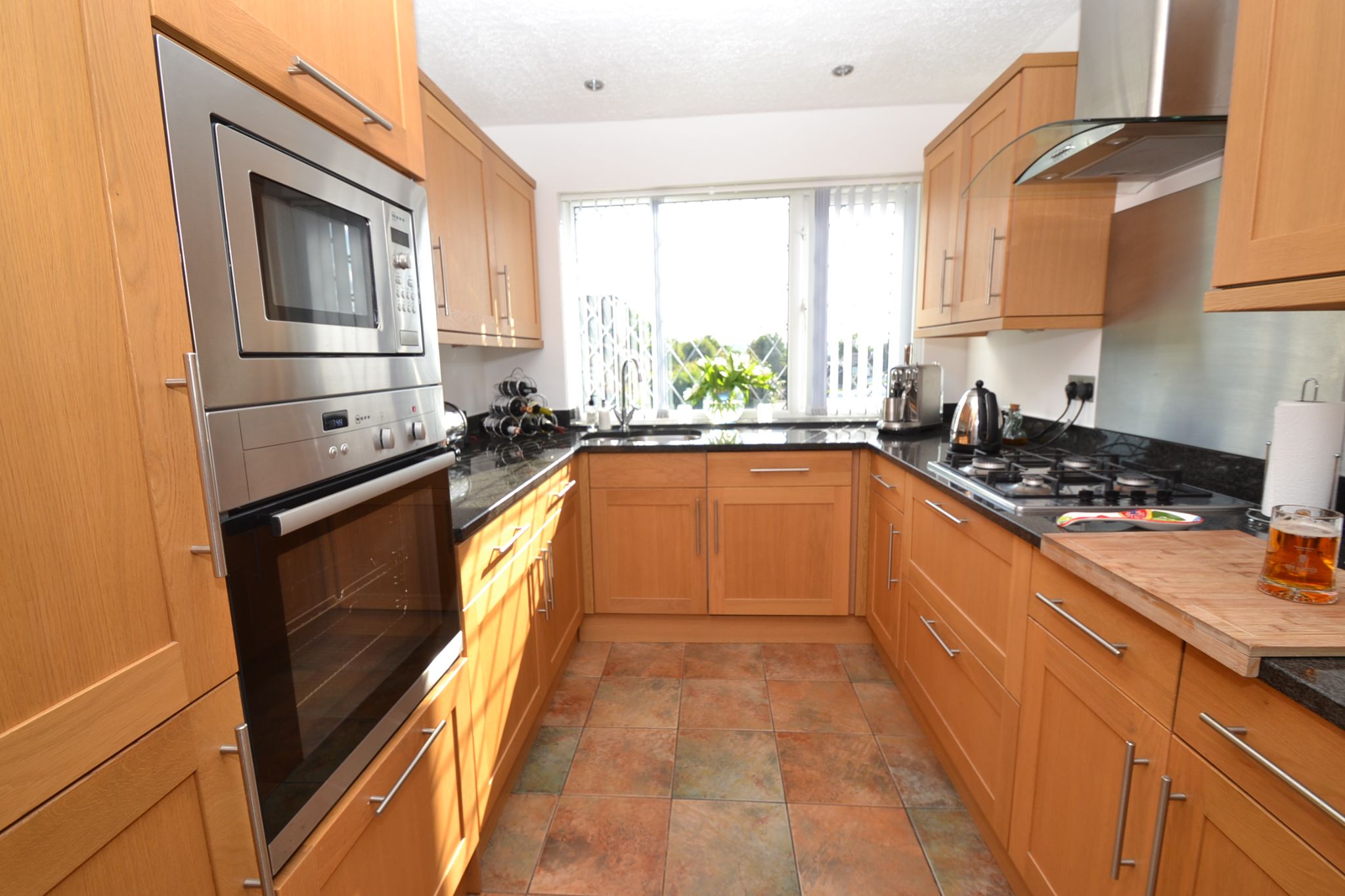 Kitchen: Extensive range of wall & base units in modern oak with stainless steel T bar handles, granite work tops and matching splash backs, under lighting, extractor over a 4 ring gas hob, built in microwave, built in electric oven all in stainless steel by Neff, stainless streel 1.5 sink with a mixer tap, inset ceiling lights, all these items are included, integrated Bosch dishwasher, Bosch auto-washer both under guarantee, Whirlpool fridge freezer, cupboard houses the Worcester Bosch condensing boiler only 2 year old still under guarantee, tiled floor.