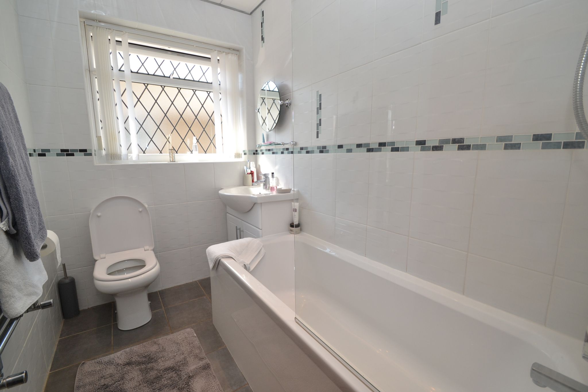 Bathroom: Three piece suite in white, fully tiled, chrome fittings, wash basin set on a high gloss white vanity unit, mono bloc mixer tap, to the bath with a chrome thermostatically controlled shower unit with shower glass screen, ceiling lights with Upvc cladded ceiling, heated chrome towel rail, slate grey tiled floor, side leaded Upvc dg window.