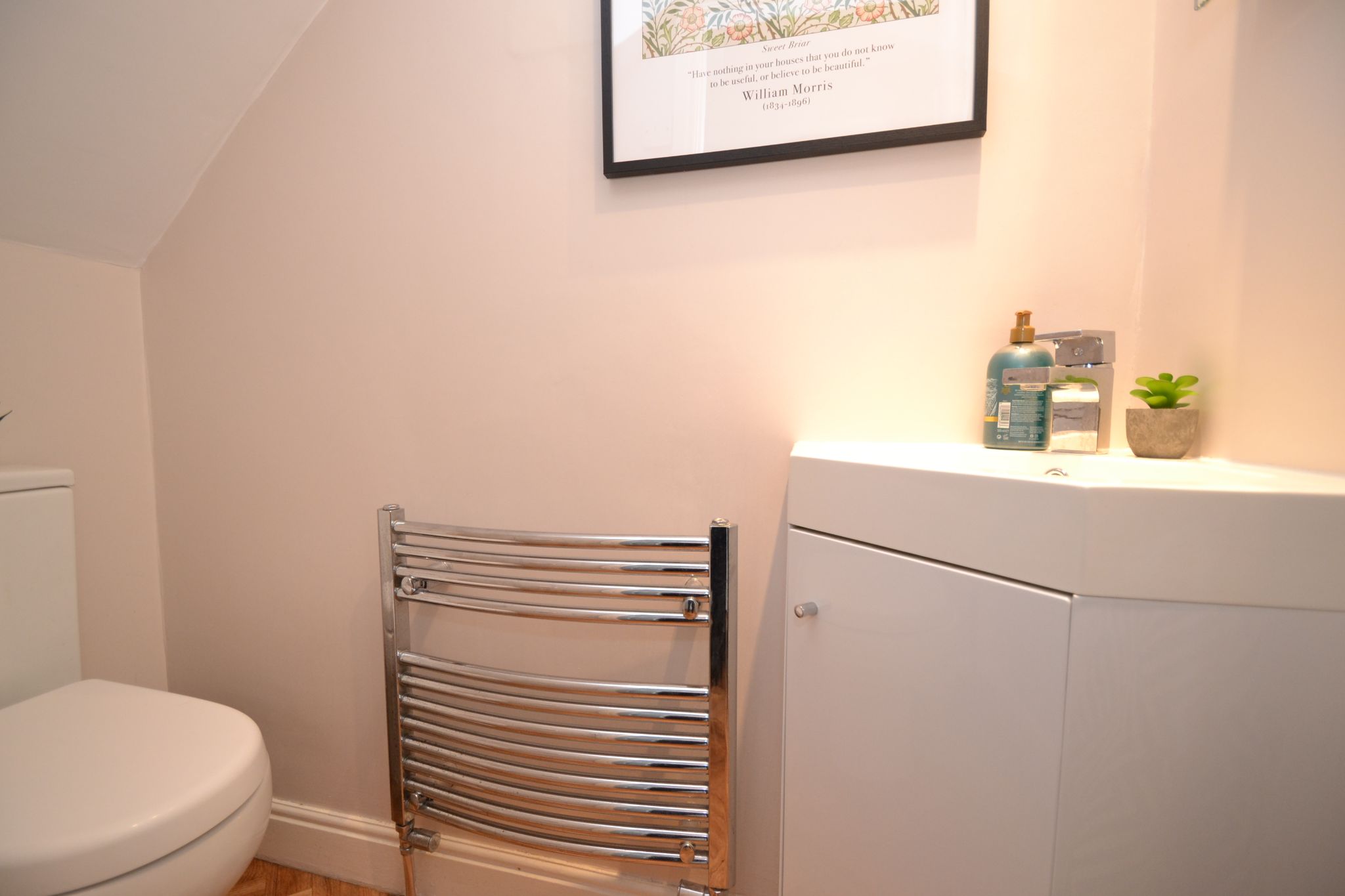 Cloaks: Low flush wc and wash basin set on a high gloss vanity unit, chrome tap, inset chrome ceiling lights, heated chrome towel rail.