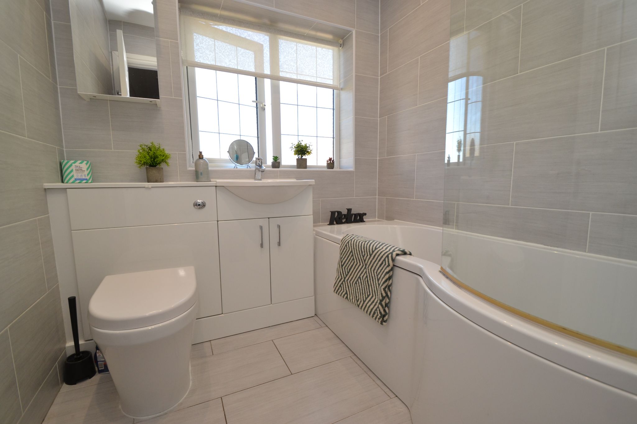Family Bathroom: Three piece suite in white with a curved bath, shower screen, Grohe chrome mixer shower tap, fully tiled, frosted leaded Upvc dg window to front with blind, heated chrome towel rail, inset chrome ceiling lights, wc and wash basin set in a built in vanity uit in high gloss white, extractor.