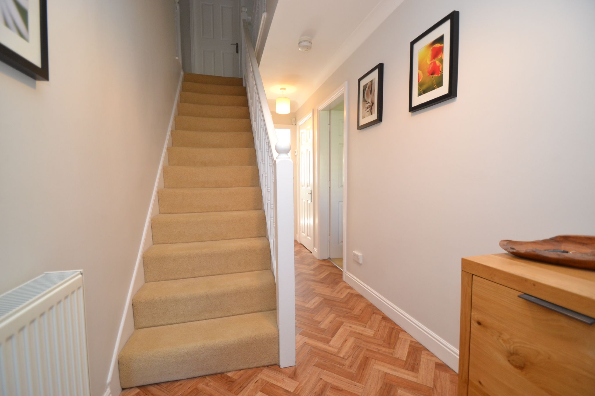 Entrance: Front composite door into the hallway, Amtico flooring, alarm, radiator, coving, stairs, coats shoe cupboard.