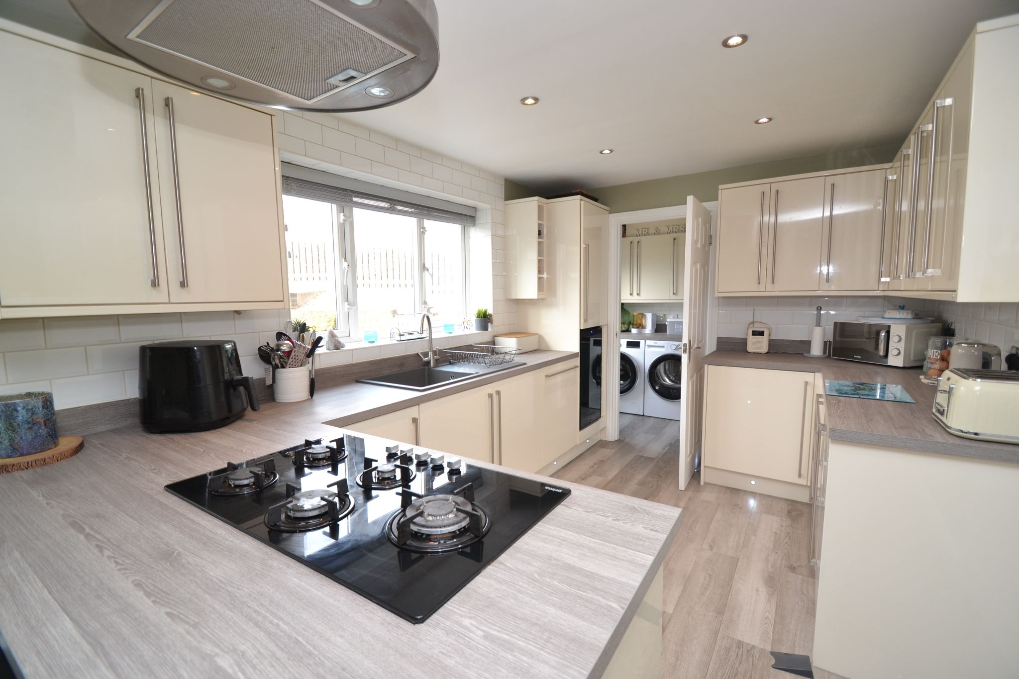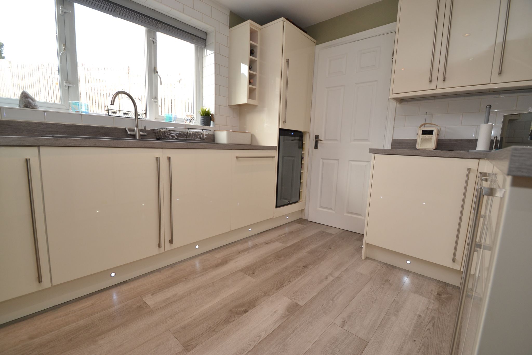 Superb Dining Kitchen: 6.20m x 2.74m (20'4" x 9' 0"). Superb range of contemporary base and wall units in high gloss, work tops with matching splash backs and white brick effect tiling above, Upvc dg window to rear, granite effect composite sink with a chrome mixer tap, integrated Bosch dishwasher, space for an electric wine cooler, feature circular stainless extractor and light hood over a 5 ring Prima ceramic gas hob, built in twin stainless steel electric ovens by Prima, breakfast bar, space for a large American fridge freezer, L.E.D plinth lights, gesture control lights, inset ceiling lights, radiator, plank effect laminate flooring, access leads on to the:-