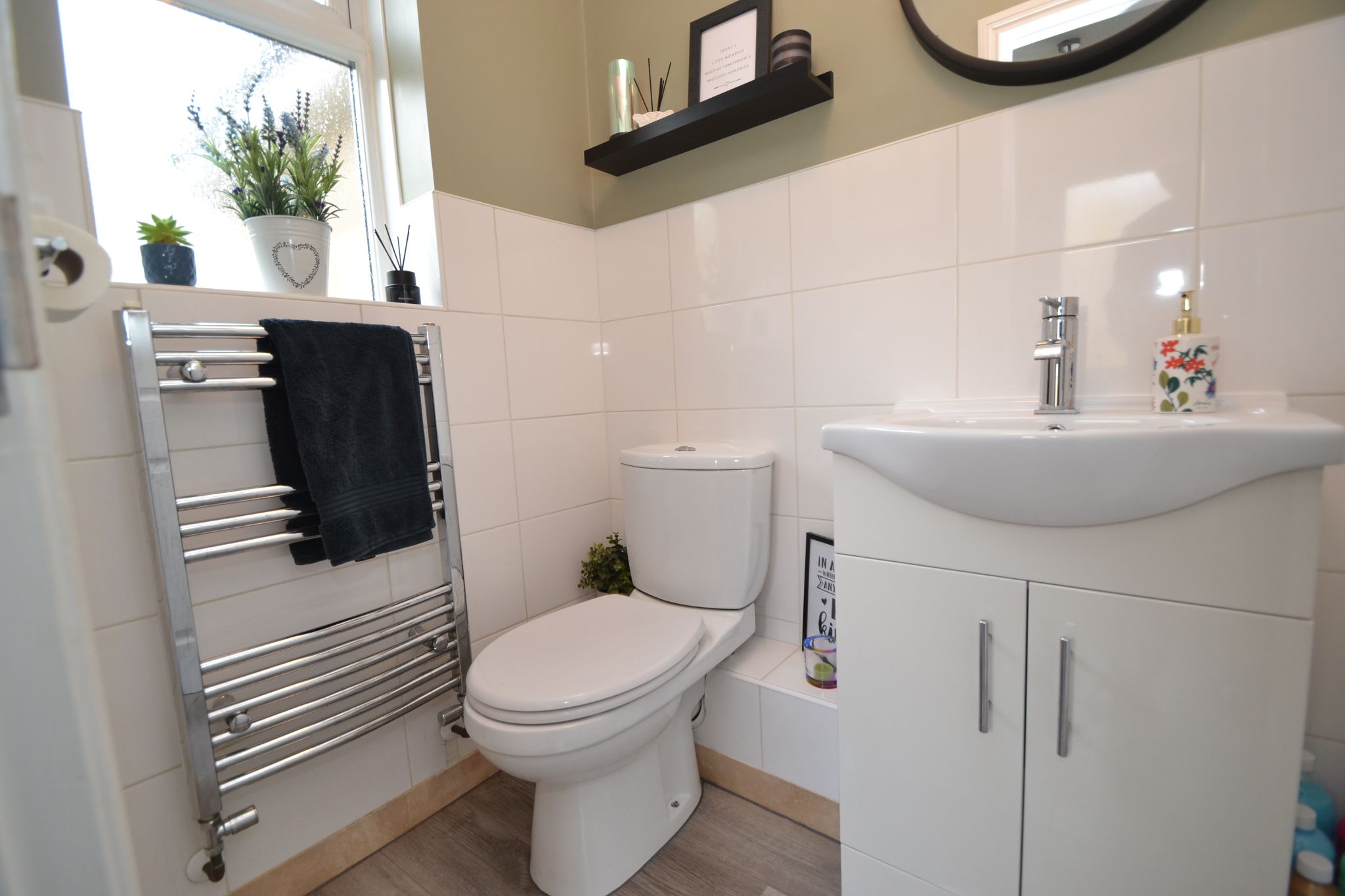 Groundfloor Cloaks/Guest W.C: Modern white wash basin set on a vanity unit, WC, suite, heated chrome towel rail, part tiled walls, frosted Upvc dg window.
