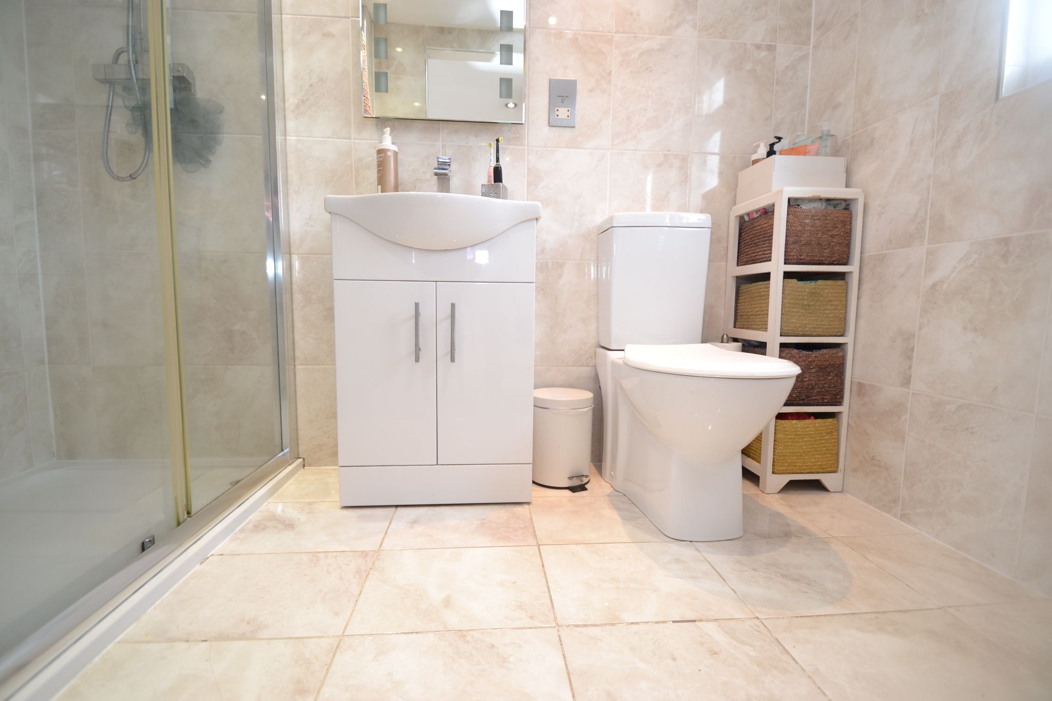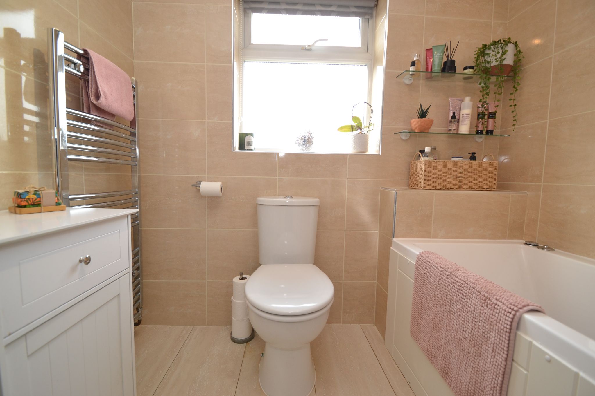 House Bathroom: 2.07m x 1.89m (6'7 x 6'2). Contemporary white suite, whirlpool style bath with shower mixer tap plus hand attachment shower unit, fully tiled, heated chrome towel rail, frosted Upvc dg window, extractor, stainless steel electric shaving point.