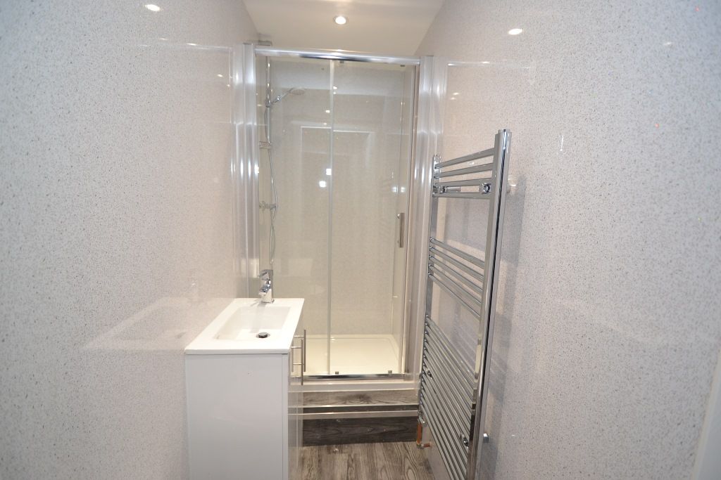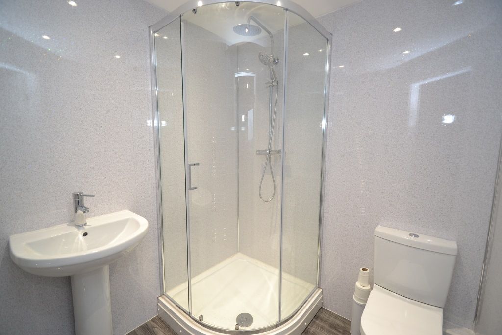 Shower Room: Shower cubicle with a thermostatically controlled chrome shower unit, heated chrome towel rail, wash basin on a high gloss vanity unit, sparkly Upvc cladded walls, extractor, inset ceiling lights.