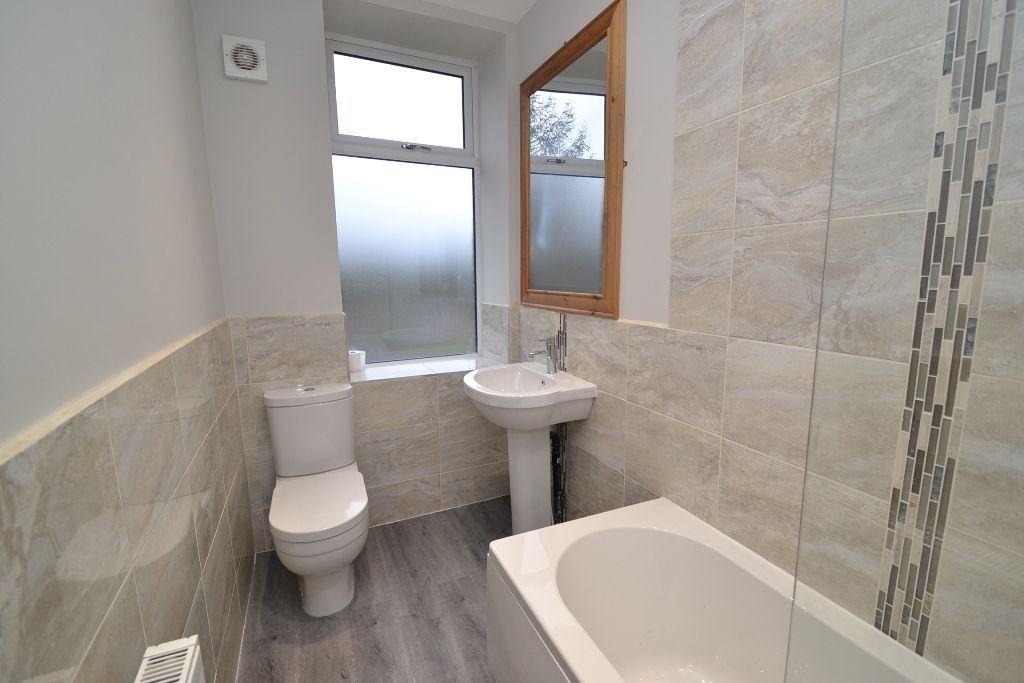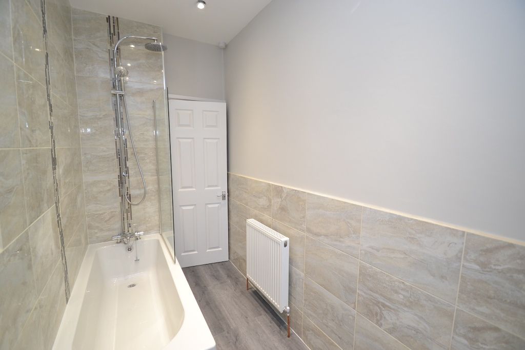 Bathroom: 2.91m x 1.37m (9'6 x 4'5). Three piece suite in white, chrome fittings, part tiled, glass shower screen, thermostatically controlled chrome mixer shower taps with double header shower, frosted Upvc dg window, ch radiator, inset ceiling lights.