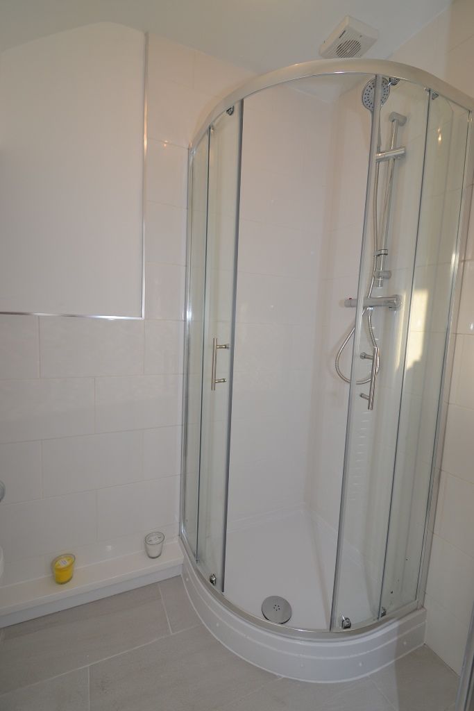 En-Suite: Wrap around shower cubicle with chrome thermostatically controlled shower unit, wc and wash basin, extractor, heated chrome towel rail.