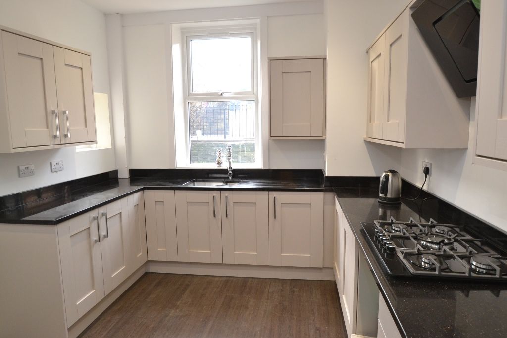Kitchen: 4.53m x 3.05m (14'10 x 10'0). Newly installed range of units in shaker style in dove grey, black granite work tops and matching splash backs, contemporary extractor and light over a 5 ring gas hob, built in electric oven, inset stainless steel sink with an extendable chrome mixer tap, integrated fridge freezer, entrance door, rear Upvc dg window, inset chrome ceiling lights, laminate floor.