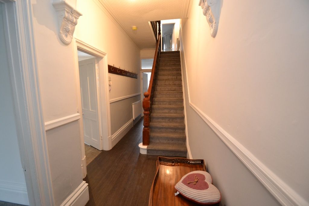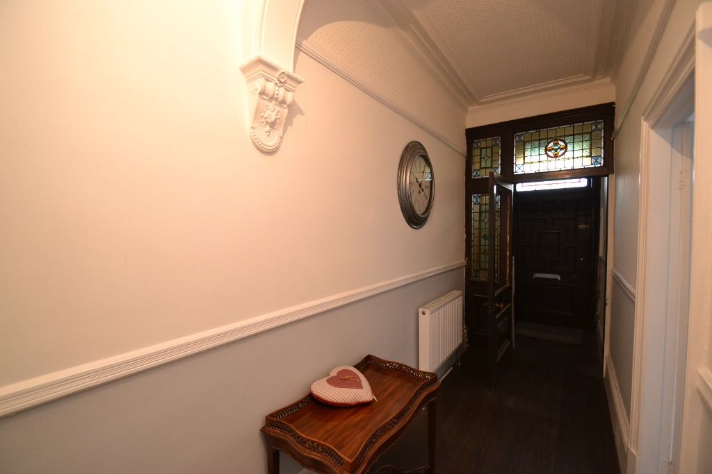 Entrance: Front outer wood door plus internal door with coloured lights into a grand hallway with a sweeping staircase and original plaster features, two radiators, laminate floor, high skirting boards, alarm panel control.