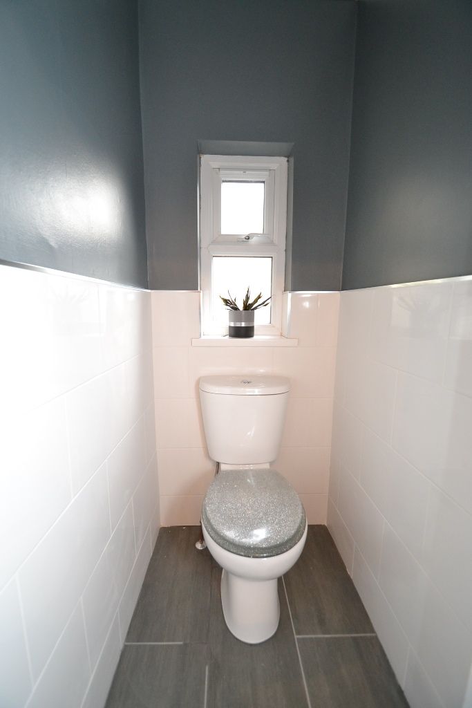 Separate Cloaks: Wc in white, frosted Upvc dg window, part tiled.